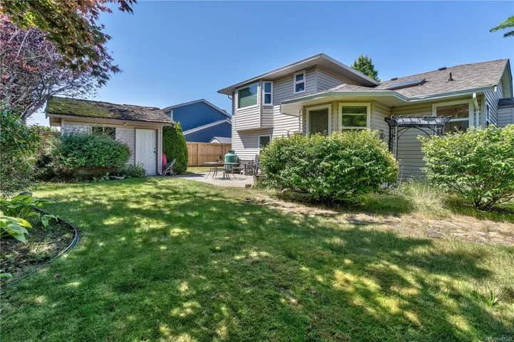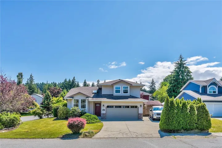 It’s all about location and this custom built 3 bed 3 bath home is well situated on a quiet, family friendly street in the desirable North Nanaimo area!! The functional split level layout features a semi-open floor plan with a bright living room, kitchen with peninsula, breakfast nook and dining room and tons of light provided by skylights. Upstairs is the Primary bed with a 4 pce ensuite and walk-in closet, 2 additional beds, a 4 pce main bath and large storage closet. On the lower level enjoy a spacious family room, laundry and 2 pc bath. Other features include quality flooring throughout, a propane fireplace, lots of storage, double garage with power door opener, sheds, large driveway with plenty of space for an RV, & fully fenced back yard with patio offering a private oasis to entertain. Walking distance to all amenities, elementary & high schools, public transportation, & 5 minutes away from Woodgrove Mall, VIRL public library, beaches, multiple parks and trails.