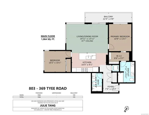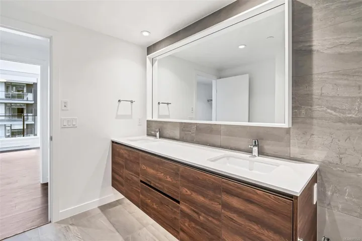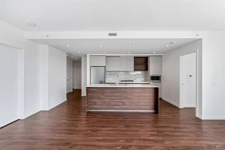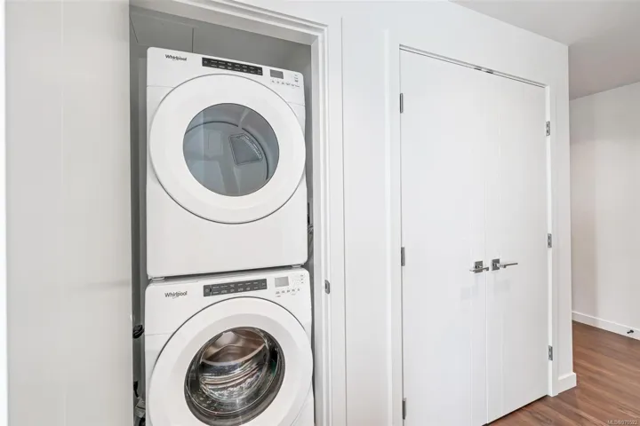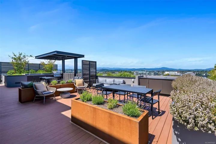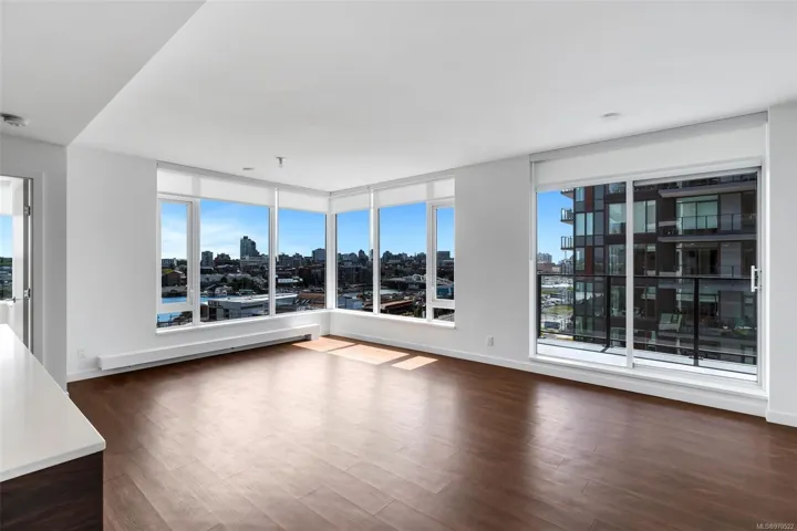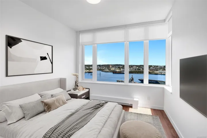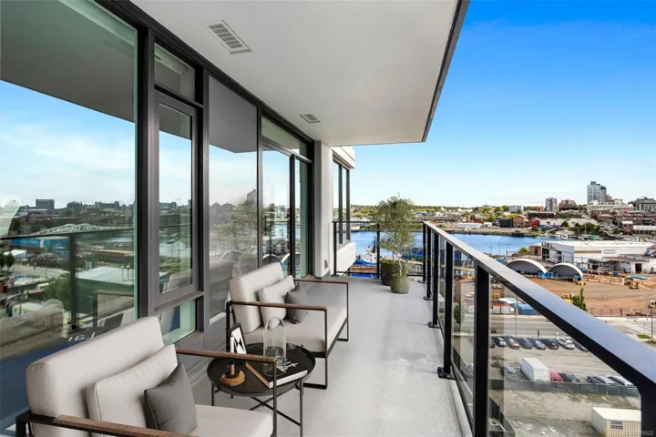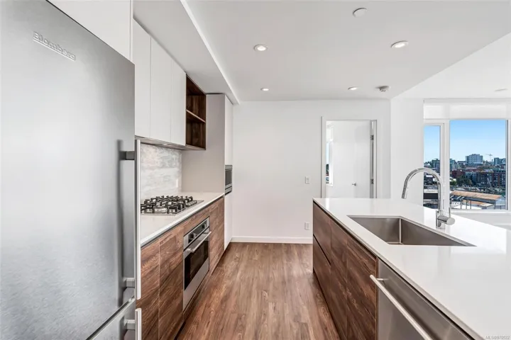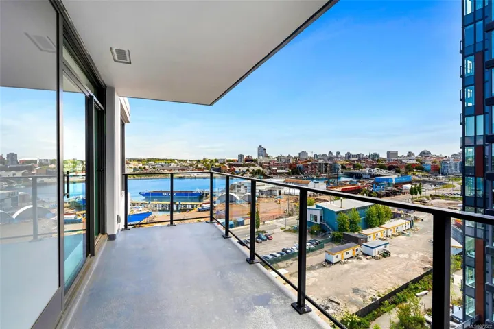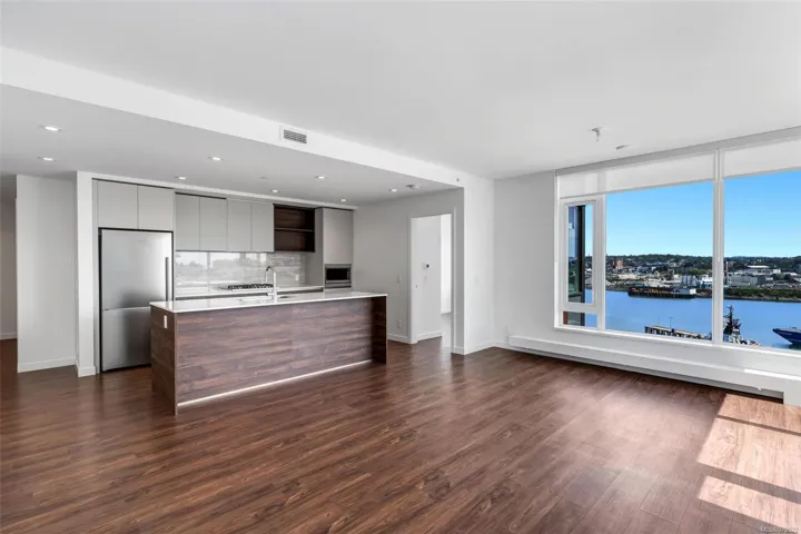 BRAND NEW + WATER VIEWS. Price INCLUDES GST. Welcome to 369 Tyee, a 12-storey concrete building recently completed and built by Bosa Development. Designed with livability in mind, this 2 bed, 2 bath unit offers 1,064 sq. ft. of living space with views of the Upper Gorge, Johnson St Bridge, Bay St Bridge, and downtown. The entertainment-sized kitchen features Stosa Italian cabinetry, quartz counters, and a single slab backsplash, paired with high-end appliances: Blomberg fridge, dishwasher, Fulgor Milano oven, and gas cooktop. This home has separated bedrooms, offering a spacious main bedroom with a walk-in closet and 4-piece ensuite. Resident-exclusive amenities include a rooftop patio with BBQs, dining and gas fire pit, an equipped fitness facility, social lounge, pet washroom, and bike tuning station. There are also two secured parking stalls side by side and a storage locker included, Which is both convenient and impressive !