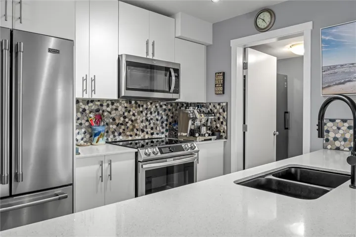 Welcome to this top-floor corner unit condo in the modern Riverstone building, where contemporary design meets comfort and convenience. This extra-bright unit boasts additional side windows that flood the space with natural light, enhancing the open floor plan and highlighting stunning mountain views. Featuring two spacious bedrooms and one well-appointed bathroom, this condo offers a secure underground parking space, ensuring peace of mind for your vehicle. For the cycling enthusiast, there’s also a dedicated bike storage area. The kitchen is a chef’s delight, complete with sleek quartz countertops, a new backsplash, and a large eating bar, providing ample space for meal preparation and entertaining. Abundant cabinetry ensures you have plenty of storage for all your kitchen essentials. Step outside and enjoy the beautiful river walkway located right behind the building, perfect for leisurely walks or bike rides that stretch for kilometers. Conveniently central to everything!