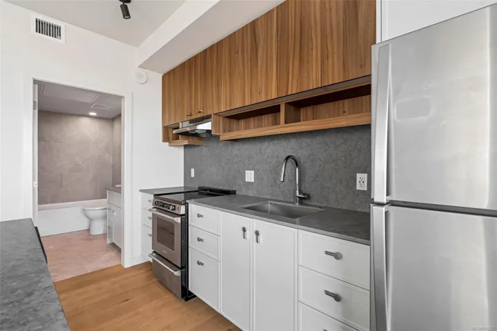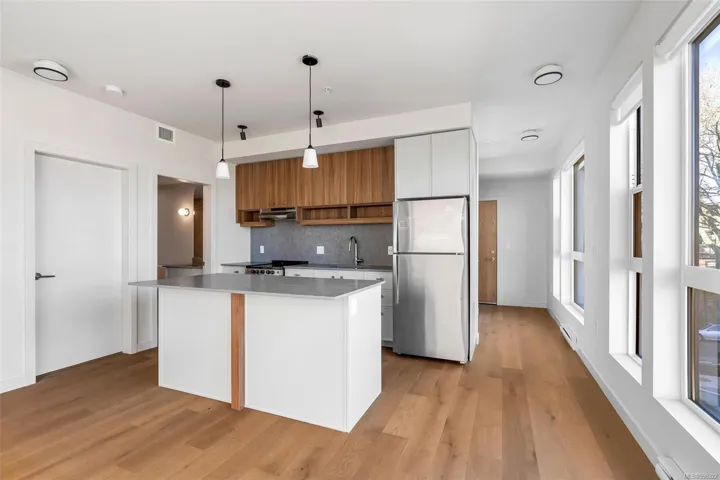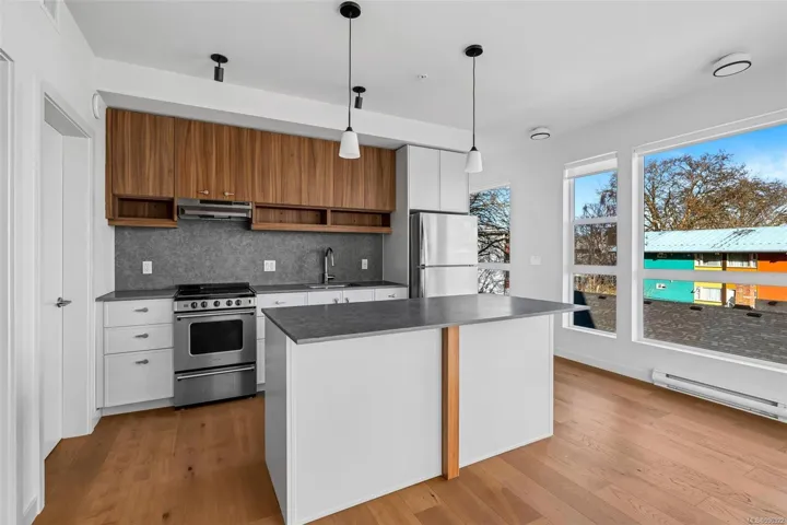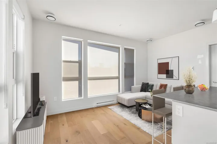 Welcome to Tresah East, a modern and stylish condominium in the heart of Victoria’s vibrant Midtown. This thoughtfully designed community offers contemporary living just minutes from downtown, the Galloping Goose Trail, and the Gorge Waterway, with easy access to parks, shopping, dining, and transit. Unit 307 is a spacious one-bedroom corner suite on the southeast side, designed for both comfort and style. The open and airy layout boasts 8’11” ceilings, wide-plank oak flooring, and high-end finishes throughout. The sleek kitchen is equipped with quartz countertops and backsplashes, along with a premium stainless steel appliance package. Additional highlights include in-suite laundry and advanced soundproofing for a peaceful living experience. Don’t miss out on this opportunity to own a beautifully designed home in one of Victoria’s most sought-after neighborhoods!