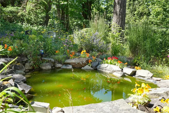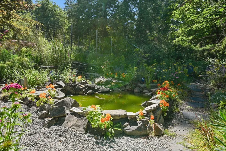 terraced gardens, a 6-ft deep goldfish pond with waterfall, a 30’ x 12’ greenhouse, heritage apple