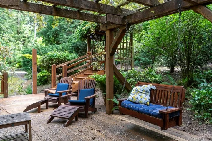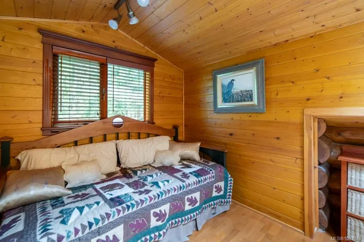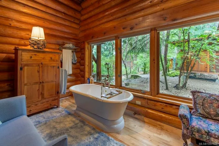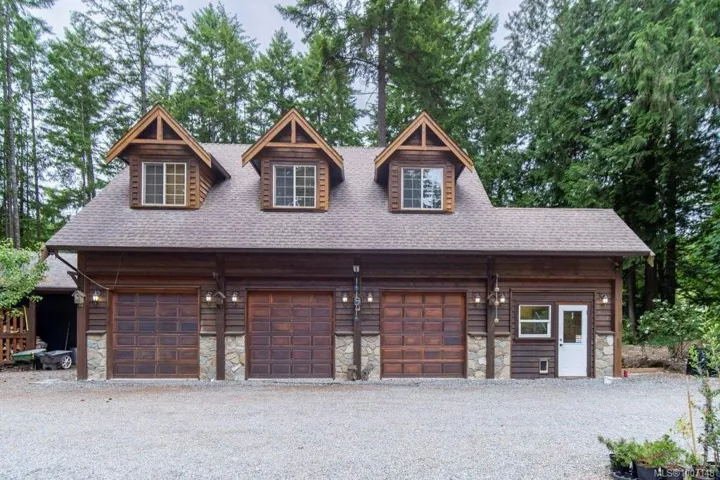 Welcome to your private 4.86-acre forest retreat in Ladysmith, just minutes from Nanaimo Airport and steps to beaches perfect for kayaking. This custom approximately 3,900+ sq ft log home backs onto protected old growth (Wildwood) and features a private lake, pergola with fireplace, waterfall, and illuminated garden paths. Outdoor highlights include lakefront campsite, 7 garages, rose garden, fenced dog area, and farm status designation. Inside boasts full-round logs, vaulted ceilings, hardwood, skylights, and a chef’s kitchen with maple cabinets, granite, copper backsplash, and walk-in pantry. Four spacious bedrooms include a luxury master with spa ensuite, loft bedroom, and private-entry bedroom with attached study. The detached carriage house includes a 1-bed suite with full kitchen and lake-view deck—perfect for guests or rental. Ideal for multigenerational living, hobby farming, or investment. A rare and peaceful West Coast gem!