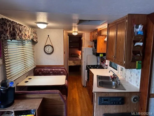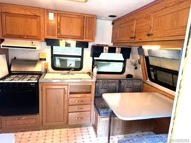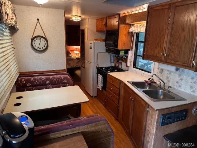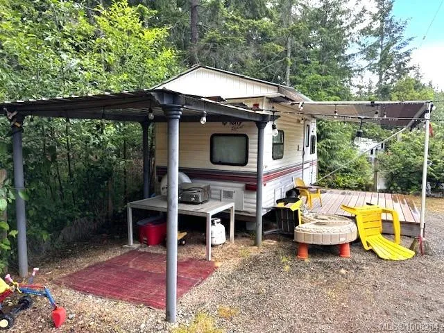 and large covered deck with railing, 19′ 1996 Terry trailer (secondary sleeping unit), with covered roof, storage shed, covered fire pit/gazebo with built in seating and large attached covered BBQ area and beverage fridge, mounted dart board and knife/axe throwing area and fully fenced yard. Extra large harvest table and benches included (deck furniture negotiable). Large willow and cherry trees add beauty as well as plenty of shade in the warmer months. Ideal lot for large or multiple families. The park is accessible year round with full occupancy allowed from April 15 to October 15. There is an annual fee of $1875 which includes water, sewer and 24 hour security.