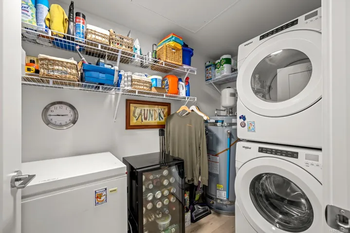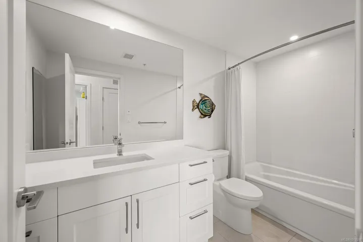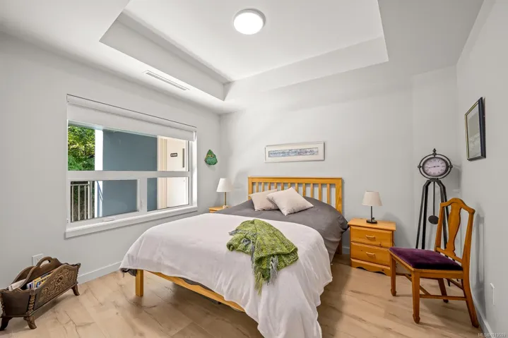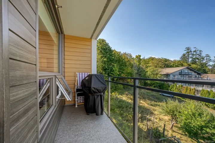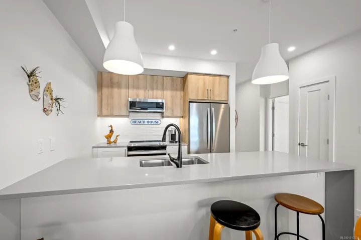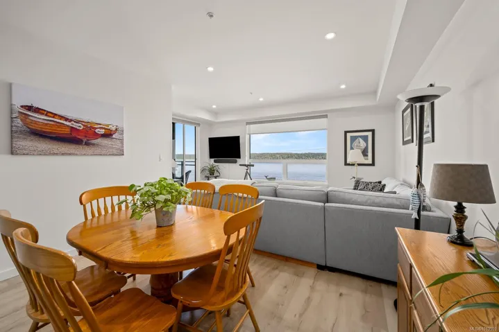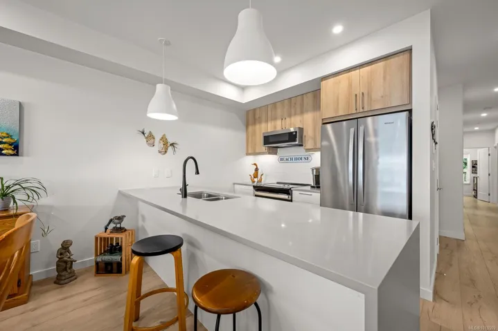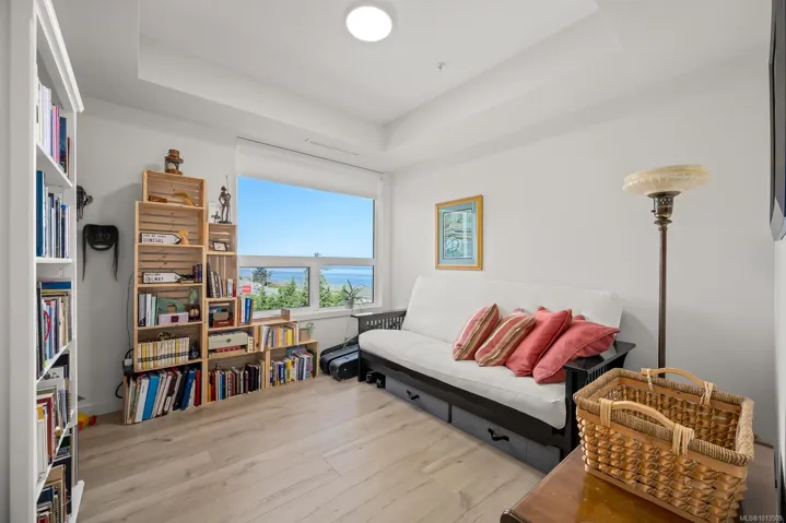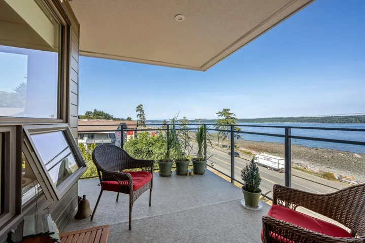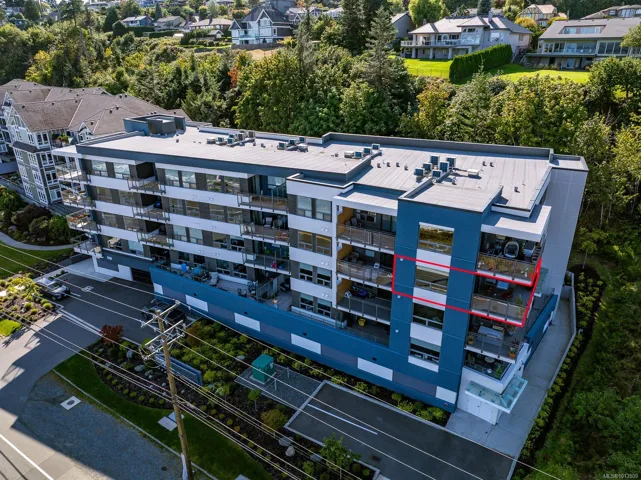 Ocean views…2 designated parking spots, both with roughed in EV charger. Quality construction, built in 2023, this property looks brand new inside and out. Exceptional features include three bedrooms plus den, open concept end unit with ocean views on two sides facing west, enjoy the boats and wildlife passing by with Quadra Island in the background. Corner location. Neutral paint tones, designer kitchen with quartz countertops, two full bathrooms, and high end appliances. The owners have enjoyed the heat pump with air conditioning, and, walking distance to marina, cafes and shopping, yet parklike quiet setting in the backyard. Open air hallways are nice for fresh air looking at the trees at the back. Secured above ground parking with cameras. Ocean views all day long with sunsets in the evening, lock up and go lifestyle. The best in appliances, modern design with lots of natural light, no GST…shows brand new.