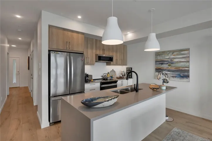 This Omnia unit blends comfort and style with ocean and nature views—and it’s ready to move in. The spacious primary bedroom offers a walk-in closet and a spa-inspired ensuite featuring heated floor tile, a double vanity, and a herringbone-tiled shower. A second bedroom overlooks peaceful green space, paired with a full bath and relaxing tub—ideal for family or guests. A bright den makes a perfect office, reading nook, or creative space.