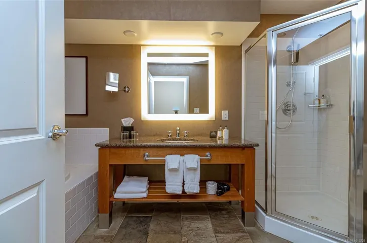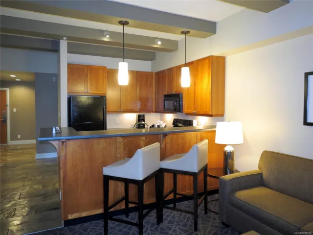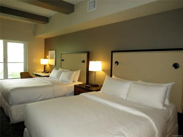 INVESTOR ALERT!! Turnkey ¼ share ownership opportunity in the premier Fairways Hotel located at the prestigious Bear Mountain Resort. Within walking distance of restaurant, spa, pool, gym, tennis, hiking trails and two world class Jack Nicklaus designed golf courses, it’s a great getaway for year-round enjoyment in a beautiful natural setting. Earn a revenue stream without being a landlord and stay up to 13 weeks a year in this professionally managed complex. It’s a great home base for day trips to discover Vancouver Island. This pet friendly hotel offers includes two adjoining suites; a one-bedroom king with full kitchen, two baths and private balcony PLUS a separate self-contained studio with two queen beds, a kitchenette, full bath and private balcony. You have the option to connect these suites which are located on the quiet side of the building overlooking the golf course. All suites are finished in a similar manner. Due to bookings, some photos shown are of a similar suite.