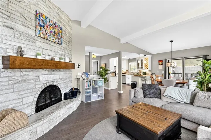 The bright main level, features a beautifully updated kitchen that opens to the dining area & a spacious living room with vaulted ceilings & a cozy wood-burning fireplace. Down the hall, you’ll find a full bathroom & three generous bedrooms, including a primary suite with dual closets & a 2-piece ensuite.