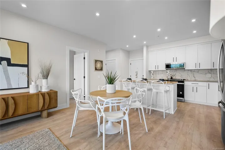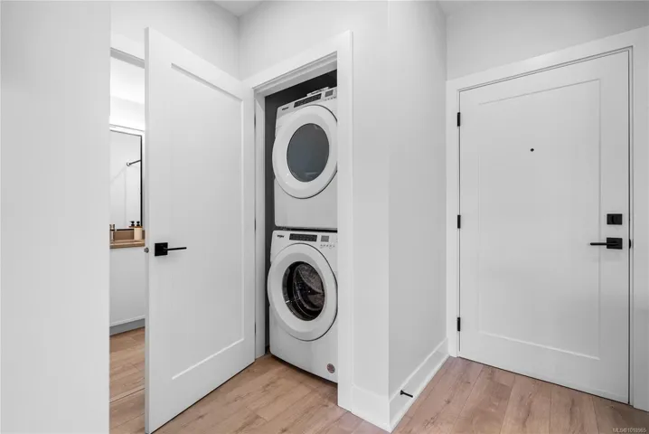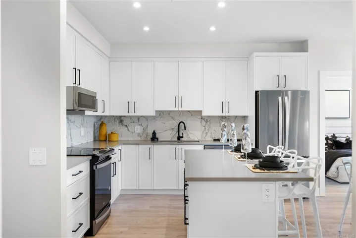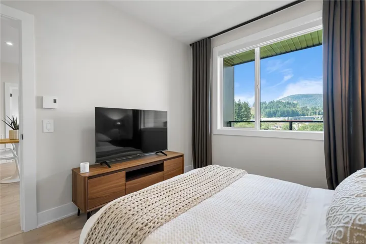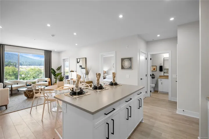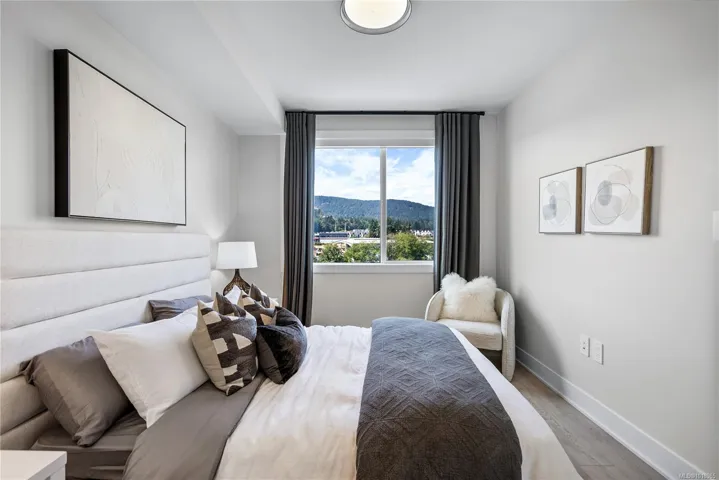 Top Floor and set perfectly to enjoy the peaceful park setting and water and nature views from your living room, kitchen, and deck. This popular floor plan is 2 beds and 2 baths and ready for immediate possession. Enjoy new construction with air conditioning, one (EV ready) parking space, and the convenience of a storage locker on your floor. Poised on the shores of Langford Lake, all homes come equipped with amenities for modern living. Bright and airy, including large windows to showcase the views, 9 ft ceilings, laminate flooring, spacious kitchens with quartz counters and a Whirlpool appliance package, window blinds and screens. Building amenities include cardio space, weight room, yoga space, lounge, & home office space. Just steps to the Ed Nixon trail and Langford Lake for outdoor adventures. Also, enjoy a short walk to YMCA, Eagle Ridge and City Center activity complex, as well as many amenities.