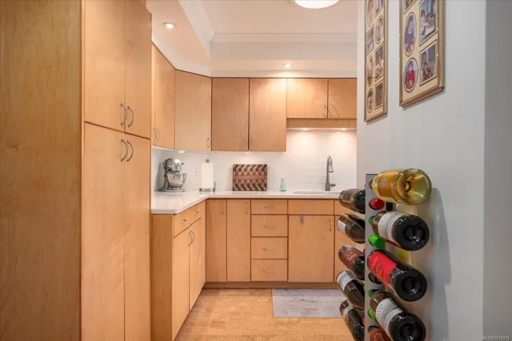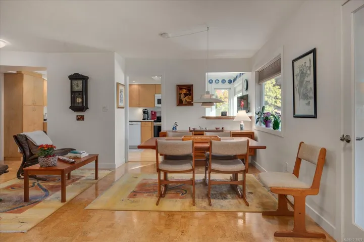 The covered tile entry leads to the dining and living room, which has warm cork flooring and a cozy gas fireplace. It has been recently updated with a new ductless heat pump, keeping temperatures perfect year round. There are two updated bathrooms, fresh outside paint, newer vinyl windows and an 11 year old roof. The manicured, fully fenced backyard has an expansive easy care composite deck, which also includes an awning. There are 2 convenient storage sheds, and the beautiful landscaping includes lovely fruit trees, with a gate to the one minute beach walk.