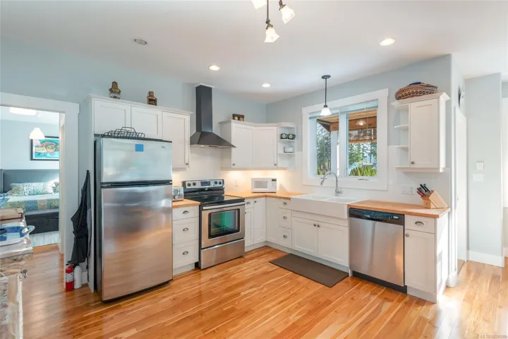 Discover this beautifully crafted 3-bedroom, 3-bath West Coast Contemporary home set along the peaceful shores of Sproat Lake. Step into an open-concept living space with 9 ft ceilings and rich teak flooring that brings warmth and elegance throughout. The kitchen features maple butcher block counters, a farmhouse sink, and easy access to a spacious deck perfectly suited for entertaining. The primary suite includes an ensuite and walk-out to a balcony offering stunning views of the lake and surrounding mountains. Sitting on a .37-acre fully fenced lot, this property offers ample yard space, a detached double garage, plenty of parking & massive 6 ft high crawl space. Enjoy the private shared dock with your own boat slip, ideal for refreshing summer swims, or quiet morning paddles. A 20-foot Bennington Pontoon boat may also be negotiated with the sale (Video available. All measurements approx., must be verified if important.).