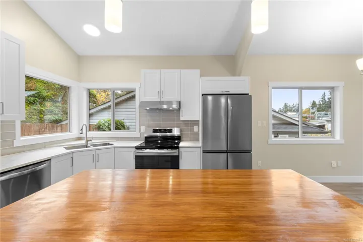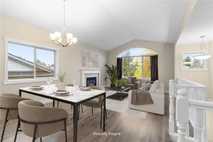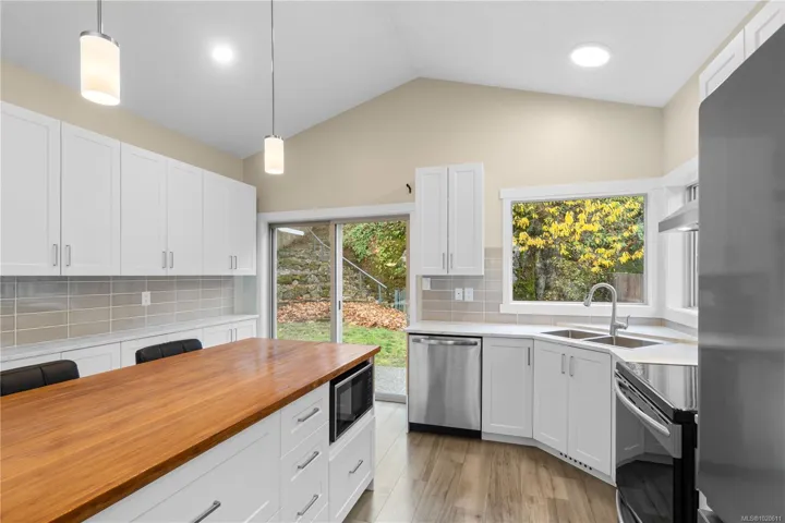 Fantastic family home walking distance to syuwenct (previously Coal Tyee) Elementary. The open-concept main level is ideal for families and entertaining, featuring 11′ vaulted ceilings, an updated kitchen with tons of storage, ample dining space, and a cozy gas fireplace in the living area. Sliding glass doors open onto a super private back patio and yard space, perfect for hanging out around the firepit. The spacious primary bedroom features a huge deep-set window for space and light and a full 4pc ensuite, while the oversized bedroom/den combo can easily be converted back to 2 separate bedrooms. The lower floor offers 2 more bedrooms plus another den/office (for a total of 6 potential sleeping rooms!), a family room and 3pc bathroom, providing a great layout for potential secondary suite or in-law accommodation. Gas heat and on-demand hot water provide great energy savings. Located in a solid family neighborhood close to Beban Park Rec Centre and the amenities of the Bowen corridor.