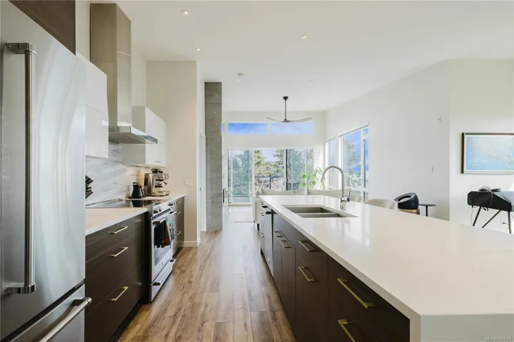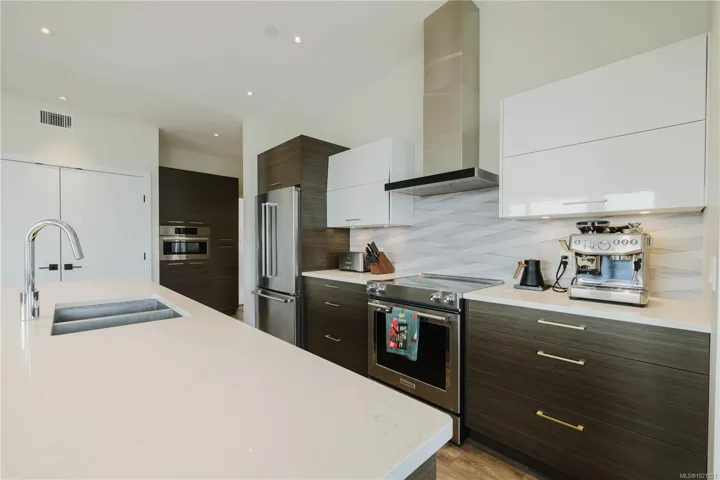 Welcome to elevated coastal living in the heart of Parksville. This beautiful 2 bed / 2 bath Oceanview penthouse is perched on the top floor of “100 Lombardy,” a quiet 2019-built boutique building with only 29 units. Enjoy 1,528 Fin Sq Ft of bright open concept living, vaulted ceilings, expansive windows, and a 234 Sq Ft balcony overlooking Parksville Bay. The quartz-appointed kitchen features stainless steel Bosch appliances, pot lighting, and a large island with bar seating. The primary suite offers a grand walk-in closet and a spa-style ensuite with dual vanities, soaker tub, and glass shower. A flex room adds versatility for storage. Built with sound-insulated construction and a strong sense of community, residents enjoy secure underground parking, low strata fees, and pet-friendly living (with approval) – All within easy walking distance to the boardwalk, beach, and downtown amenities.