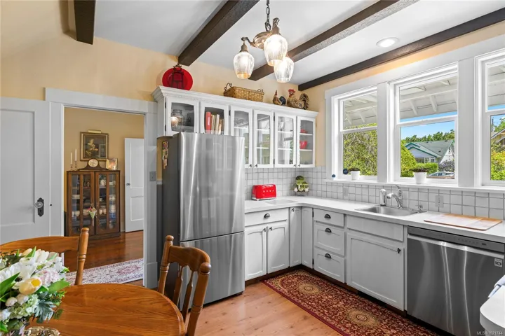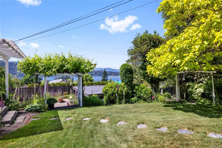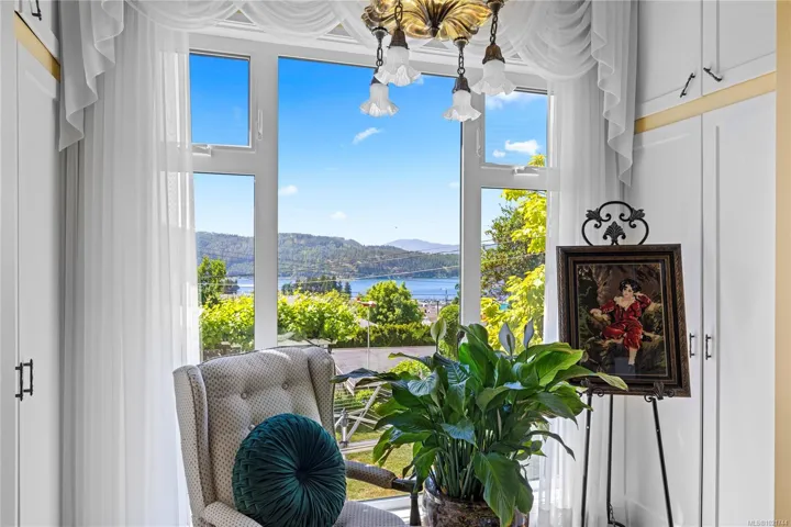 METICULOUSLY MAINTAINED CHARACTER HOME – offering stunning water views & a perfect blend of charm & modern updates. The main floor features a spacious primary bedroom complete with an en suite bathroom, providing a serene retreat. Enjoy gatherings in the formal living room with its inviting wood-burning fireplace, or retreat to the well-appointed study. The updated kitchen is a culinary delight, complemented by a convenient powder room. Venture upstairs to discover 3 additional bedrooms, along with a full bathroom. The lower level boasts a large recreation room, an extra bathroom, and ample storage space, ensuring plenty of room for all your needs. Step outside to the beautifully landscaped gardens in the fully fenced yard, where you’ll find 2 detached shop/garage and a charming tea house, perfect for relaxation or entertaining. This home has seen many upgrades, including a durable metal roof, energy-efficient vinyl windows, and a heat pump for year-round comfort.