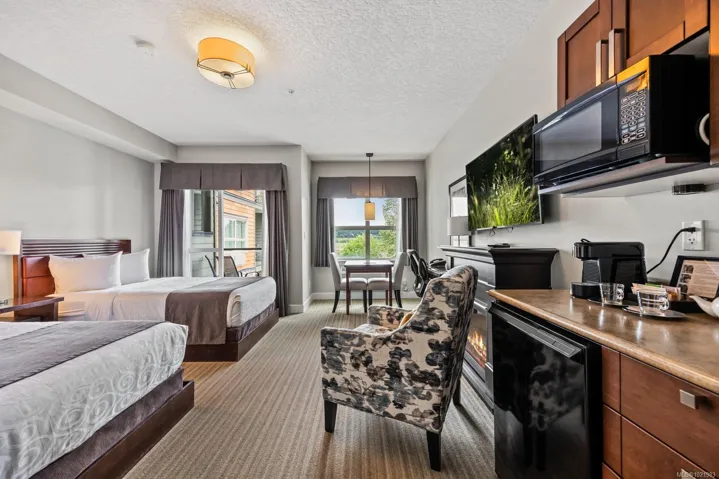 Don’t miss this investment opportunity to own a full share luxurious double hotel room. This unit accommodates up to 4 guests with pool and river views. Own all four quarter shares with 100% ownership and flexibility of dates to visit up to a maximum of three out of every four weeks per month. Fully furnished with upscale finishes, electric fireplace, and a balcony with stunning views. Enjoy 2 double sized beds, large shower and separate bathtub and access to amenities like Oh Spa, Locals Restaurant, outdoor pool, hot tub, fitness room, and meeting facilities. Experience upscale living with air conditioning, elevator, and secured entry. Own this condo retreat near golf courses, lakes, rivers, mountains, and all Vancouver Island offers. Just 15 mins to Comox airport, 4 mins to Driftwood Mall, and close to many restaurants. Fully managed by the hotel, Priced well below assessed value. Management fees not included in monthly strata fee. Sale is plus GST.