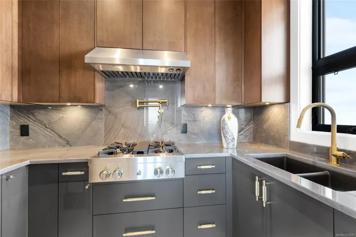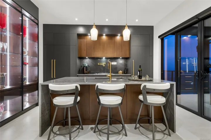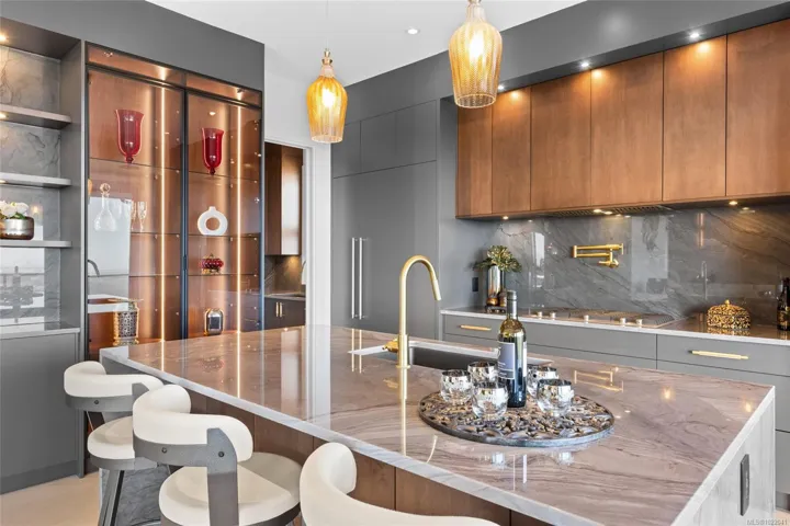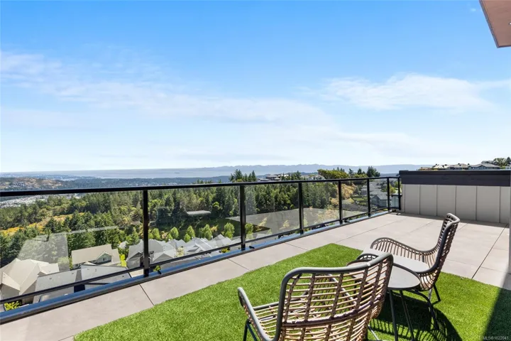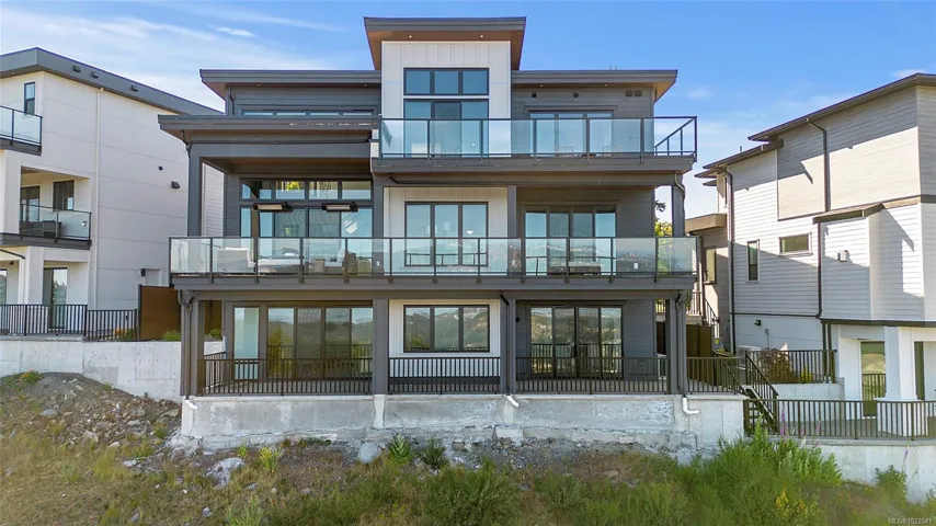 Discover the ultimate in sophistication with this custom-built residence located high on Bear Mountain. Multi-generational living possibilities complete with an elevator ensuring effortless access across all levels! Panoramic views of the ocean, mountain, & city lights, make this truly a living masterpiece that evolves with the light of the day. Designed for the discerning homeowner, the grand foyer & soaring ceilings create an inviting sense of scale, while expansive windows draw in the natural beauty and light. The heart of the home is a chef-inspired kitchen featuring top-tier appliances, beautiful island, & a discrete prep kitchen for effortless hosting. Meticulous craftsmanship shines through every detail, from radiant-heated floors & Brizo fixtures to iconic Buster + Punch hardware. Dual primary suites each offer spa-inspired ensuites while the versatile lower level provides warmth & privacy . Complete with a separate one bed legal suite.