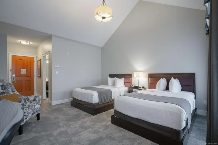 Quarter ownership at the Old House Hotel in the beautiful Comox Valley offering majestic mountains, sunbathed beaches, championship golf greens, gorgeous rivers, secluded lakes, the magnificent ocean and various activities from skiing, fishing, boating, kayaking, golfing, etc. This is a great opportunity for anyone who would like to have a recreational property. The Old House Hotel is an upscale resort centrally located in Courtenay offering underground parking, meeting facility, luxurious spa, outdoor pool & hot tub area. This unit is located on the 3rd level on the city side & offers 2 double beds, kitchenette, spacious bathroom with separate tub & shower. Further equipped with flat screen TV, electric fireplace, table & chairs & outdoor balcony. This opportunity is not intended to be lived in full time. Strata fees ($153.94) & owner’s assoc. ($218.17) fees payable each month. Managed & rented out by Hotel Mgmt Co with the owners receiving a revenue statement every 3 months.