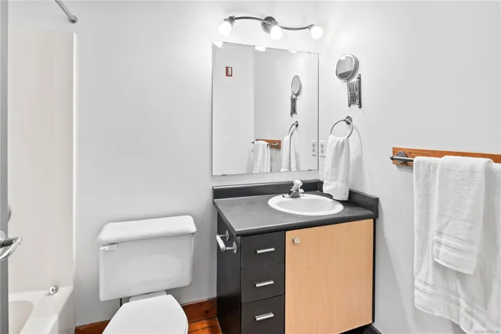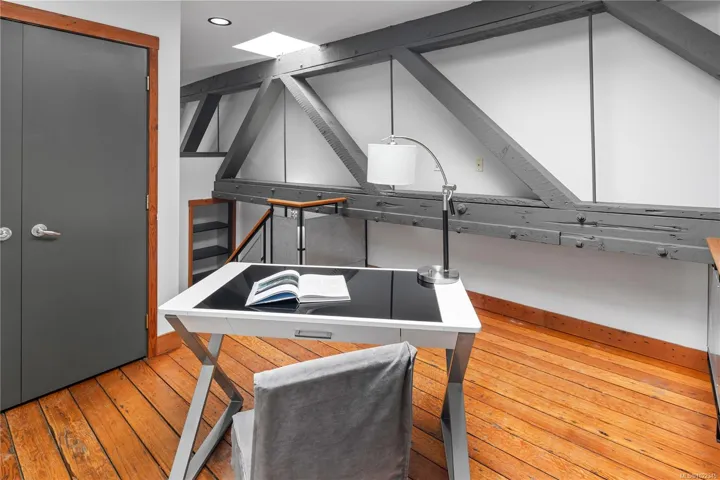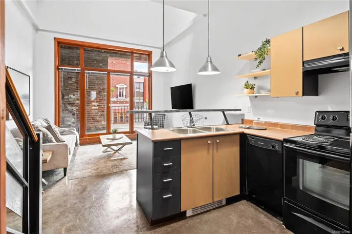 Welcome to the iconic Kinemacolour heritage building. This unique townhome exudes historical charm combined with an industrial edgy vibe. This home features two spacious bedrooms and two bathrooms. The open-concept living area is enhanced by an impressive 20ft vaulted ceiling, creating an airy and inviting atmosphere perfect for both relaxation and entertaining. Enjoy two private balconies, one offering a serene escape overlooking the secure, gated alleyway, while the other provides an additional outdoor retreat with captivating views of Chinatown and Government Street. The loft’s original brickwork adds a captivating sophisticated industrial touch. Plus, with the work/live zoning designation, you have the flexibility to operate your business from home. Listing photos are of a similar unit and are virtually staged; please book a showing to see how Unit 204 varies. Off-site parking available, monthly fee $231, inquire for more details.