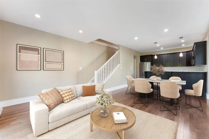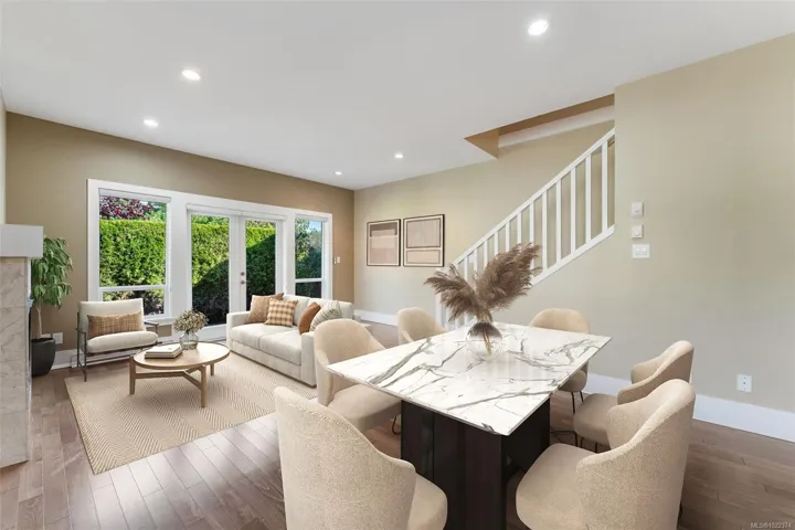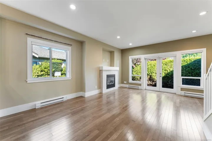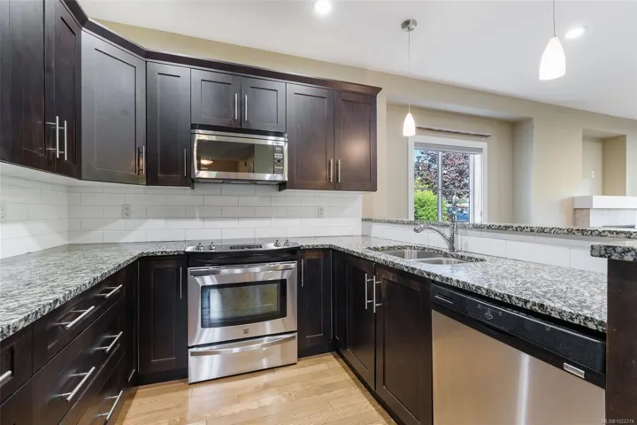 Modern townhome tucked away in a quiet Sidney neighbourhood, just minutes from the ocean and all the charm of downtown. 3 bds & 3 bth over 1,500 sq. ft., this home blends comfort w/ convenience. Main floor is bright & inviting with 9’ ceilings, hardwood floors, gas fireplace, & heated bathroom floors. The kitchen has granite countertops, stainless steel appliances, Grohe plumbing fixtures, & ample workspace, flowing seamlessly into the dining and living areas. With the option of a primary bedroom on the main floor or upstairs, this home is designed with flexibility to suit your lifestyle, guests, or family. Private patio for morning coffee or summer barbecues, with minimal yard work to maintain. A single-car garage provides secure parking & storage. Additional highlights include ground-level entry for easy access, and the security of a boutique complex of just four units. Priced well below the assessed value & vacant for quick possession.