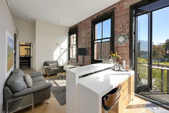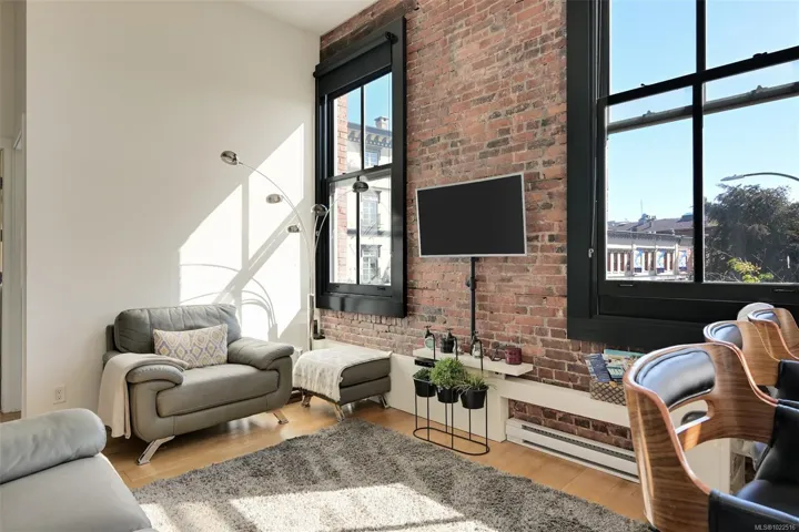 Experience urban living in the iconic Janion building, where heritage charm meets modern style. This bright SOUTH-FACING 2-bedroom features original exposed brick, oversized windows, and views of the bustling City, and Inner Harbour. Designed with efficiency in mind, it offers a built-in wall bed, integrated storage, engineered oak flooring, quartz countertops, a hidden-drawer dishwasher, refrigerator, freezer, and in-suite washer & dryer. Enjoy in-floor heating in the bathroom for added comfort. The Janion boasts premier amenities: rooftop terrace with BBQ and kitchen, fitness centre, conference room, bike/kayak storage, and internal beach access. Located in the heart of Downtown Victoria, steps to shops, dining, and the waterfront. Ideal for students, digital nomads, or snowbirds as it’s fully furnished; this New York style condo is your gateway to the best of the city. Location, lifestyle, and iconic views—this is modern living at its finest.