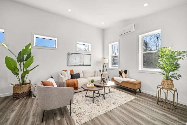 New and improved specification! The Phase 2 Lewis model is a gorgeous contemporary style home spanning 1,104 sq ft, with 2 bedrooms, 1 bathroom and a dreamy south-facing private covered patio. You’ll love the open concept kitchen dining layout with soaring 11 7′ ceilings, tasteful fixtures and accents throughout, modern high gloss white kitchen cabinets, tiled backsplash and quartz countertops. Don’t forget the full appliance package. Large laundry room with sink and upper cabinets. Vaulted ceilings continue through to the bedrooms with large windows giving plenty of light. With steel frame construction, metal roof and metal siding, maintenance is minimal. The homes are incredibly well insulated and the efficient mini split heat pump will keep you warm and cool. Enjoy the extra long concrete driveway, fenced backyard, landscaping, irrigation and a shed as standard. Enjoy the plentiful storage space with numerous closets and a 5′ poured concrete crawlspace. GST applies