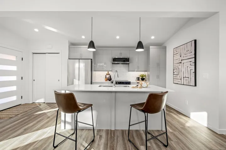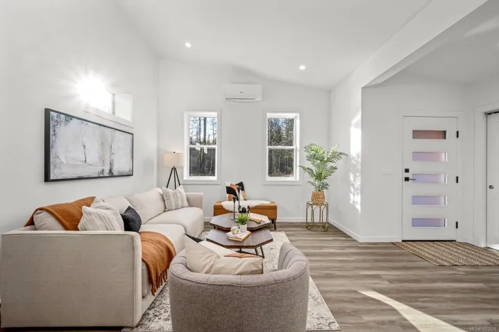 New and improved! This is a Phase 2 Lewis plan spanning 1,104 sq ft, with 2 bedrooms, 1 bathroom and boasting a dreamy south-facing private covered patio. You’ll love the open concept kitchen dining layout with soaring 11 ‘7″ ceilings, tasteful fixtures and accents throughout, modern high gloss grey kitchen cabinets, full appliances, tiled backsplash and quartz countertops. Large laundry room with sink and upper cabinets. Vaulted ceilings continue through to the bedrooms with large windows giving plenty of light. With steel frame construction, metal roof and metal siding, maintenance is minimal. The homes are incredibly well insulated and the efficient mini split heat pump will keep you warm and cool. An extra long concrete driveway, fully fenced backyard, landscaping, irrigation and a shed as standard. Enjoy the plentiful storage space with numerous closets and a 4’ poured concrete crawlspace. GST applies. Book your showing today