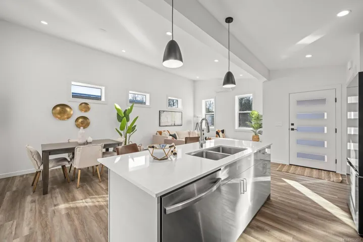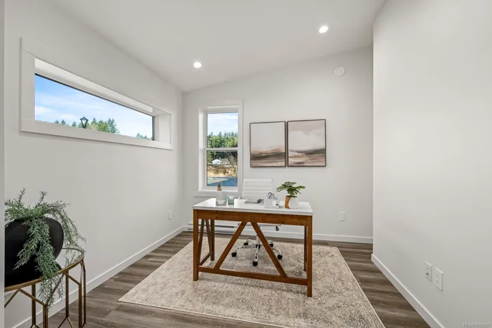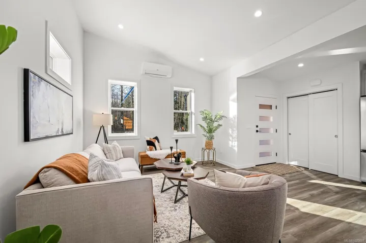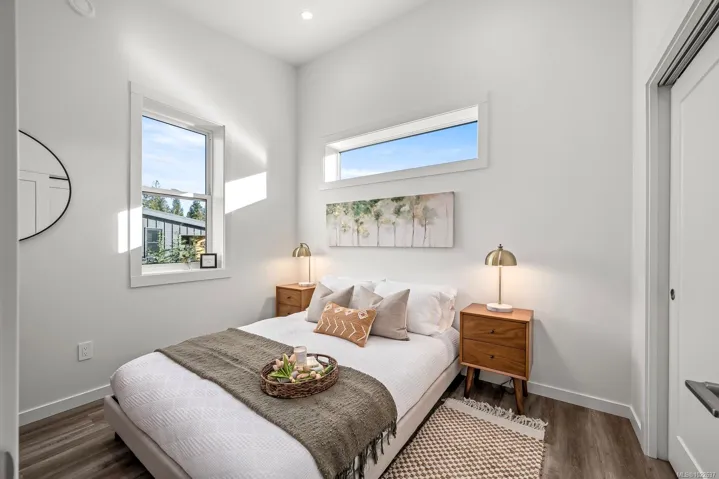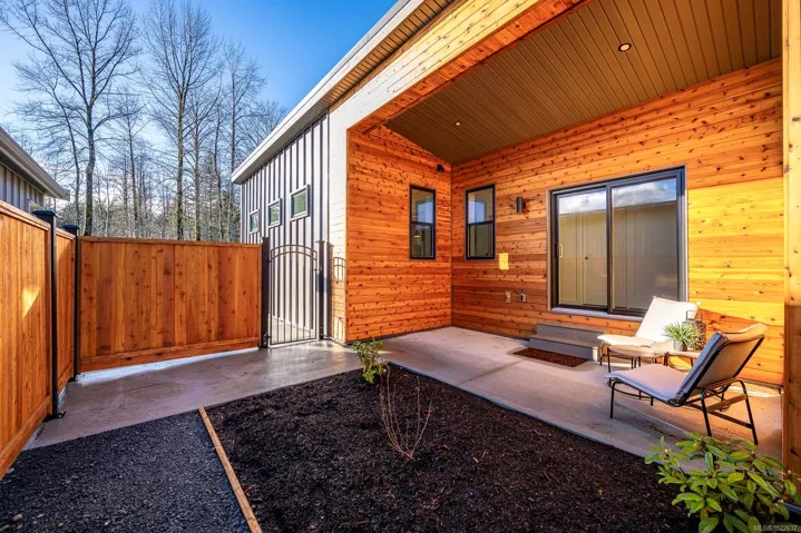 New and improved! This is a Phase 2 Lewis plan spanning 1,104 sq ft, with 2 bedrooms, 1 bathroom and boasting a dreamy south-facing private covered patio. You’ll love the open concept kitchen dining layout with soaring 11 ‘7″ ceilings, tasteful fixtures and accents throughout, modern high gloss grey kitchen cabinets, full appliances, tiled backsplash and quartz countertops. Large laundry room with sink and upper cabinets. Vaulted ceilings continue through to the bedrooms with large windows giving plenty of light. With steel frame construction, metal roof and metal siding, maintenance is minimal. The homes are incredibly well insulated and the efficient mini split heat pump will keep you warm and cool. An extra long concrete driveway, fully fenced backyard, landscaping, irrigation and a shed as standard. Enjoy the plentiful storage space with numerous closets and a 4’ poured concrete crawlspace. GST applies. Book your showing today