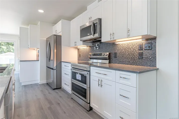 Discover this fully renovated 5-bedroom, 3-bathroom home located at 5350 Metral Drive in Nanaimo. The main residence offers 3 bedrooms, including a primary bedroom with ensuite, access to the sundeck and a kitchen featuring a prep area with an extra sink. An electric fireplace adds charm to the living area, while a spacious sundeck expands your entertaining space. The lower-level suite includes 2 bedrooms, 1 bathroom, and a separate garage space, ideal for extended families or rental income. Recent upgrades include new plumbing, electrical, roof, windows, heat pumps up and down, and appliances. Close to restaurants and shopping including Superstore, Pleasant Park Elementary, parks, transit, and more, this home offers both comfort and convenience.
