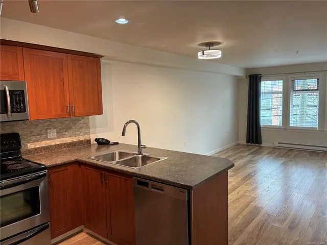 Situated in the heart of Langford, this quiet open concept, spacious 2 bedroom & 2 full bath third floor condo has a great layout. Fabulous kitchen with lots of cupboards, counter space & breakfast bar seating. Master bedroom has a walk-in closet & a full en suite. Large bedrooms both have exterior windows. Convenient in-suite laundry, large coat closet & linen closet. Secure underground parking, storage locker, bicycle room, exercise room, common room, Japanese courtyard garden & a roof top patio. A short stroll to shopping, restaurants, parks, championship golfing, the new university & all amenities. Minutes to the highway. Pets & rentals allowed. Bike to town on the Galloping Goose Trail across the street, super convenient location. And now newly painted, come have a look!