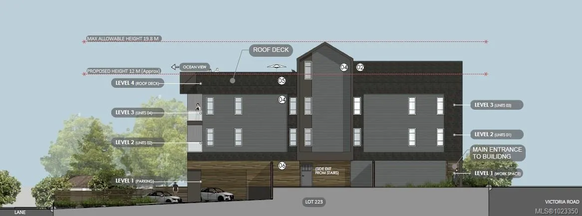 223 Victoria Road presents a rare and highly strategic multi-family development opportunity in Nanaimo. Unlike the large-scale multi-family projects that dominate the market and require substantial working capital, this approved four-unit townhouse-style complex offers a more accessible entry point for builders while maintaining strong investment potential. The property is ideally situated within walking distance of downtown and central shopping, ensuring long-term desirability.This project features a unique mix of residential and live-work spaces. The standout unit is a rare live-work design with a 521 sq. ft. ground-floor office space that connects via an internal staircase to a two-bedroom, 774 sq. ft. residential unit above.The second level also has a separate exterior entrance, maximizing functionality and rental appeal.The remaining three units are well-designed two-bedroom residences of approximately 820 sq/ft.,each with a private outdoor deck and townhouse-style exterior access