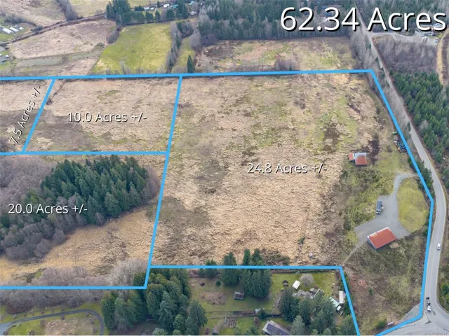 An exceptional opportunity to acquire over 62 acres just minutes from Courtenay, comprising four separately titled parcels sold together. Each parcel permits one residence, creating a rare opportunity for four estate-sized homes with registered access easements that can be put in place. The land offers excellent soils, abundant water, and a highly desirable setting near the Comox Valley Parkway and Visitor Centre, blending privacy with convenience. Existing improvements include a newer office building, implement shed, and a character barn, providing immediate utility. Aside from being prime Agricultural land with unbelievable access to major transportation arteries, this could be ideal for a private estate purchaser, family compound, or builder seeking future estate home development in a location where large acreages close to amenities are increasingly scarce. Quick access to highways, city services, ferries, and the ocean further enhances long-term value. Price plus GST.