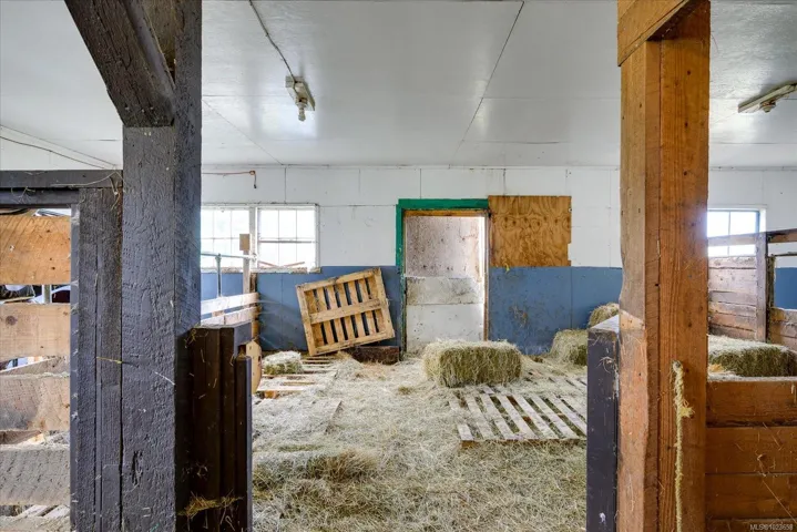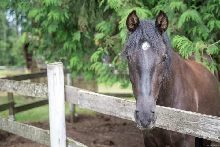 Idyllic 34 acre property in the desirable Jingle Pot area of Nanaimo! At the end of the winding driveway, across cleared fields and a small stream is a 3 bed plus den, 2 bath farmhouse with a wrap around porch, large barn, paddocks, implement shed, outbuilding and riding ring. The homestead is surrounded by mature trees providing both privacy and shade. Every room in the house has beautiful views, especially the picture windows in living room and primary bedroom that look out across the fields over to Mount Benson – the sunset is spectacular! As ALR land there are plenty of options for self sustainable living with hayfields and gardens, plus the barn and outbuildings serve a variety of businesses and hobbies. Come enjoy quiet and solitude just minutes from town.