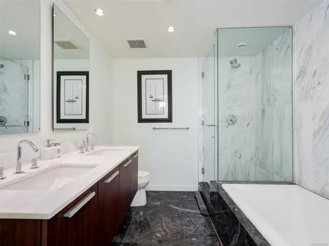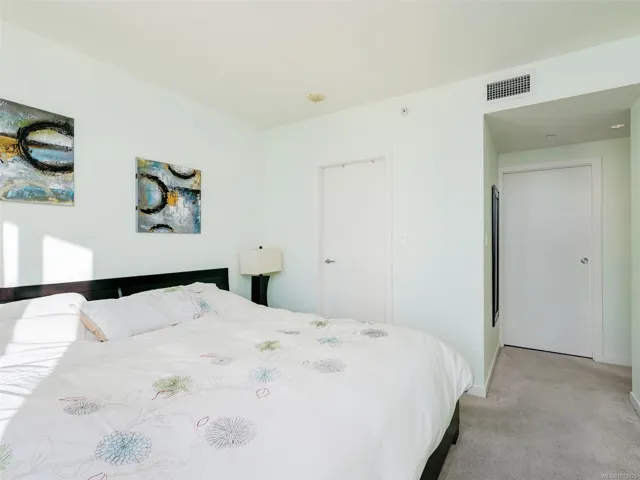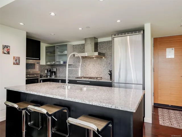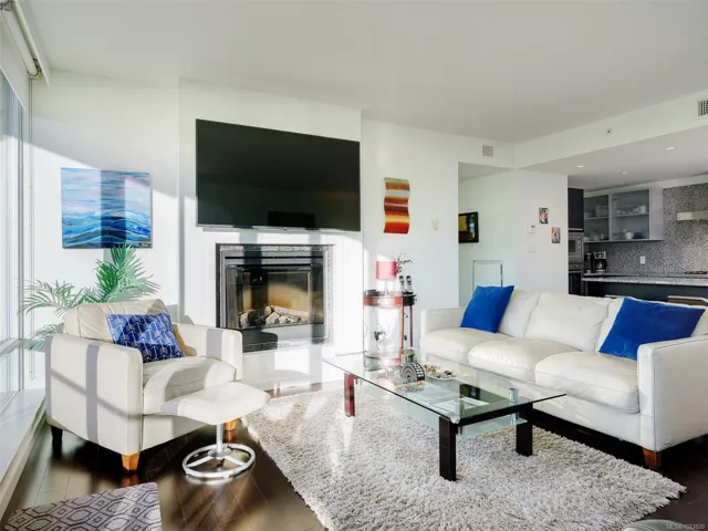 ATTN INVESTORS! This unit owns a transferable share in the Victoria Waterfalls Hotel and generates massive short term rental income, with flexibility for own use. Contact listing agent for more info. This exceptional 8th floor, west-facing 2 BR / 2 BA condo in the heart of downtown Victoria. Floor-to-ceiling windows fill the home with natural light while showcasing panoramic city views, including the landmark Empress Hotel and distant mountains. The open-concept design features granite countertops, stainless steel appliances with gas range, engineered hardwood flooring, and in-suite laundry—offering a refined balance of style and function. The spacious primary bedroom includes a spa-inspired ensuite, while the second bedroom and full bathroom provide flexibility for guests or home office use. A premier steel-and-concrete building, The Falls offers concierge service, fitness centre, swimming pool, hot tub, secure underground parking, bike storage, and pet-friendly living.