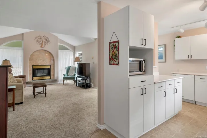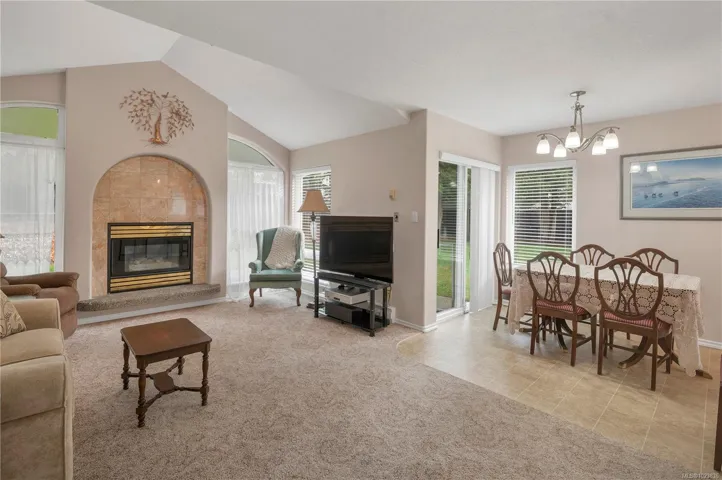The attractive 2 arched window and gas fireplace are the focal points of this vaulted ceiling living room, aside from the private backyard view beyond