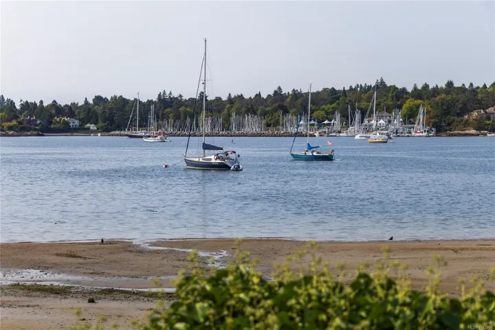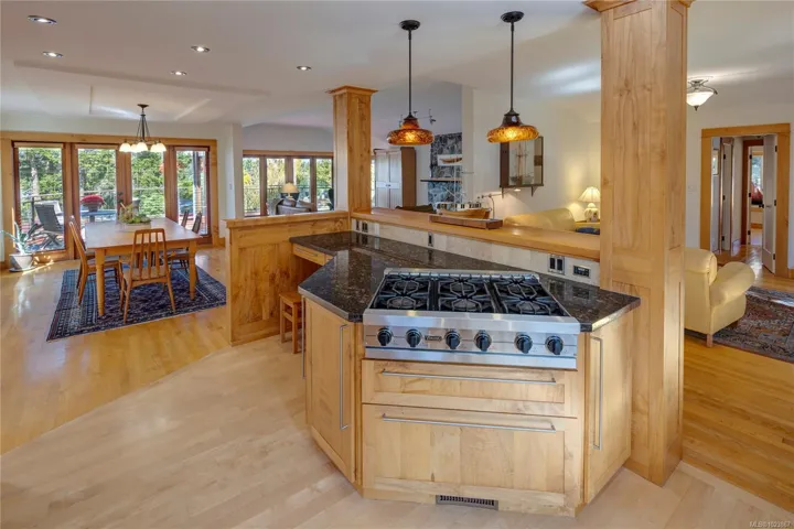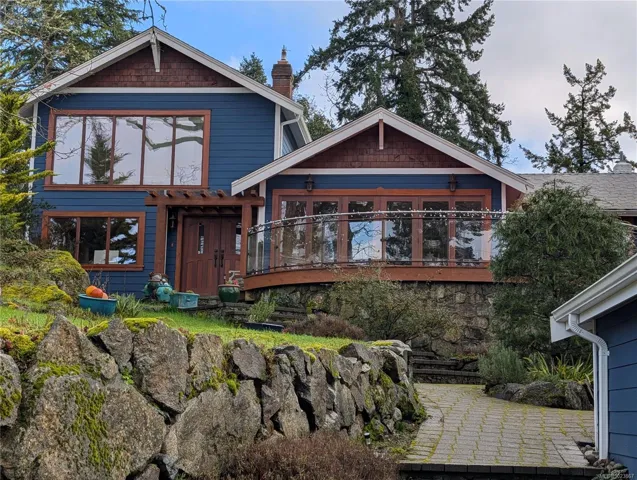 Modern luxury in a stunning West Coast home with rich wood detailing throughout. Set on a quiet, beautifully landscaped 0.36-acre private lot, this hidden gem offers the best of indoor-outdoor living – enjoy ocean views and sunsets from the front deck and unwind on the secluded back patio. The open-concept layout features vaulted ceilings, hardwood floors, and a natural rock fireplace with wood stove. Oversized windows and custom wood/glass doors bathe the space in light. The Ribbon Maple gourmet kitchen includes chocolate granite counters, a 6-burner Viking stove, and double ovens – ideal for entertaining. Upstairs, the primary suite has tranquil Cadboro Bay views and an ensuite; a second bedroom also includes a 4-piece ensuite. The main level offers a media area, a third bedroom with 4-piece bath and a den/home office that could be an extra guest room. Extras: double garage, 3 side-by-side parking spots, detached studio with 2-piece bath, and mature trees.