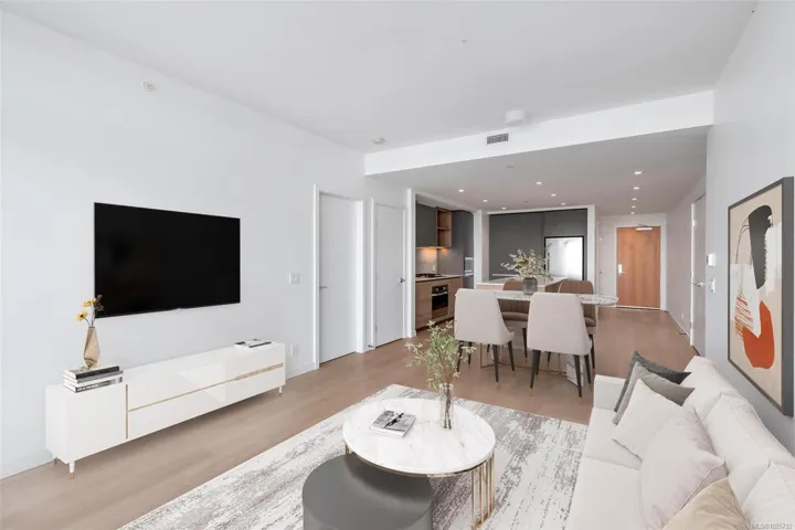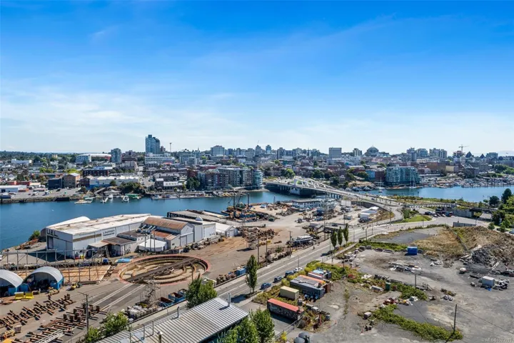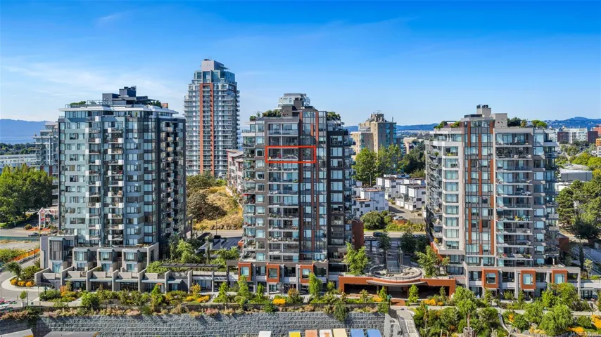 Perched on the 11th floor, this beautifully appointed 2 bed/2 bath home offers sweeping city, ocean & mountain views, enjoyed from both the expansive 179 sf. balcony & the bright, open interior. The open-concept layout is anchored by a chef-inspired kitchen featuring a quartz island, gas range & custom cabinetry, perfectly suited for everyday living & entertaining. The primary bedroom is a true retreat, complete w a walk-through closet, spa-inspired ensuite. A thoughtfully separated 2nd bedroom and full bath provide ideal flexibility for guests, family or a dedicated home office. Secure ug parking & a storage locker are included. At Dockside, the lifestyle is as compelling as the location, w curated amenities including a fitness centre w Peloton bikes, rooftop terrace with BBQs, residents’ lounge, pet wash station, bike storage. Step outside to the Galloping Goose, cafés, dining and downtown. Pet-friendly, rental-friendly, still under warranty, built by award-winning BOSA Development.