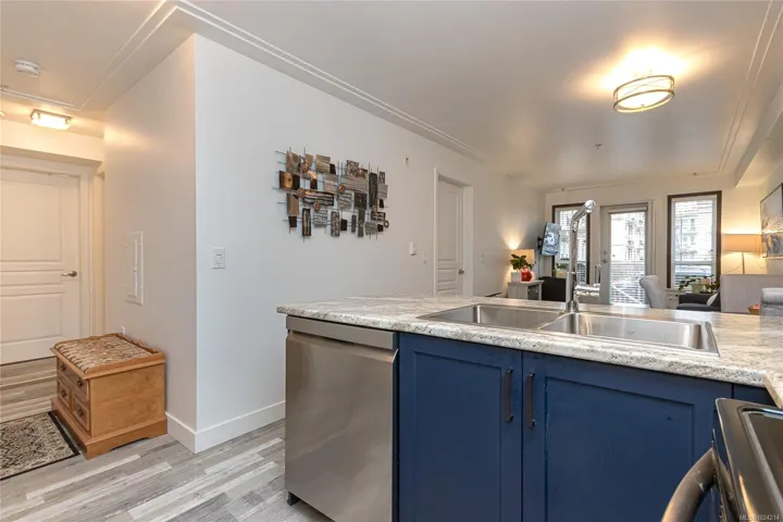 OPEN HOUSE SUN. APRIL 19, 1-3. Location, Location, Location in Langford Town Core! This 1 Bedroom + Den is the perfect affordable condo option! This unit faces away from the street in a quiet building, located next to the park. A stylish open concept design with a spacious kitchen, eating bar & new bright cabinet facings. New flooring & a personal balcony adjacent to the living room. The large primary bedroom accesses the main bath which has been renovated to include a new shower, toilet and vanity door facings. The versatile Den is perfect for a home office, guest room, or creative studio. In-suite laundry too! Building amenities include Bike Storage, Fitness Center, Underground Parking, Roof Top Balcony, Outdoor Gathering Space and a Meeting Room. A well cared for building with so much to offer. Close to transit, shops, dining & medical services! Ideal for professionals, first-time buyers, or downsizers looking for convenience without compromise. 2 small dogs & rentals permitted.