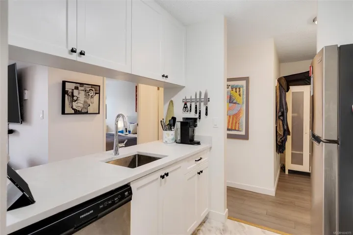 Open house Saturday, January 31st 11:00-12:30. Stylish and updated south facing unit in a steel and concrete building. Built-in dining room storage, as well as a home office desk in the bedroom, makes this a very functional space. Vinyl plank flooring throughout, updated kitchen with stainless steel appliances and herringbone flooring pattern right on style trend. Bathroom with clean and newer tub surround, and updated flooring and fixtures. Parking wait list available (approximate time is 3 months). The building offers a gym and steam room, dedicated bike storage, on-site caretaker. The laundry room has plenty of commercial machines-takes the worry of leaking and the maintenance of the machines out of your suite. Nothing to do but unpack!