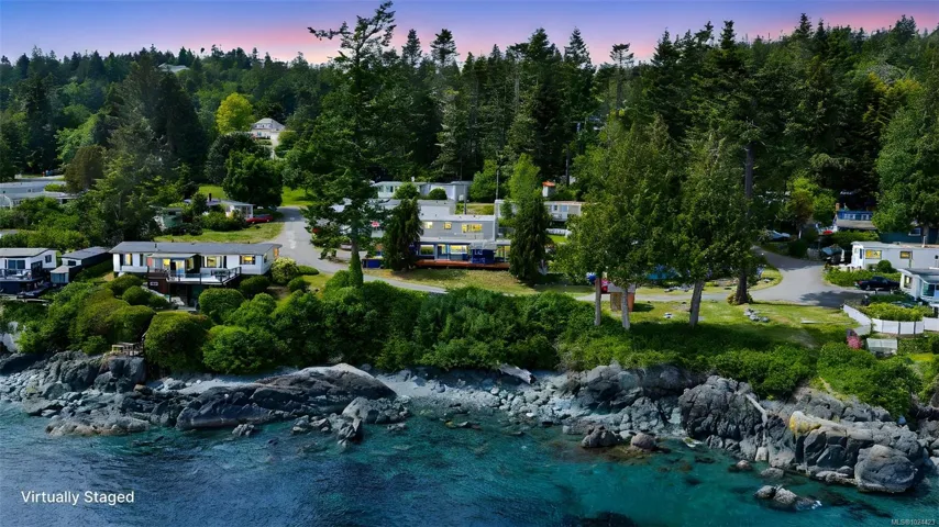 Fulfill your dream of oceanfront living—without the oceanfront price tag! This stylish,contemporary mobile home is ideal for the modest consumer of any age seeking a low maintenance lifestyle! Imagine beachcombing, soaking in an ever-changing ocean view, witnessing orcas & more while nestled near a mature eagle’s nest. Drink in incredible views from the kitchen, livingroom or primary bedroom. Embrace the outdoors from the expansive deck oasis. Launch the kayak or boat nearby & experiece this authentic naturalist’s haven.Professional updates inside and out including deck reinforcement & transparent railings, vapor barrier, corrugated metal siding, copper wiring, large vinyl windows, new kitchen, flooring, trim, plumbing and fixtures. This stylish home offers comfort & peace of mind while delivering a stunning coastal setting. 10 minutes from the town of Sooke with easy access to shops,services,dining & recreation. Pets welcome; 1 dog under 20 lbs & 1 cat, or 2 cats.