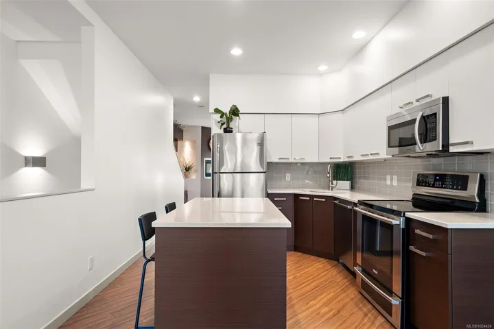 This beautiful 4 BEDROOM 3 BATHROOM townhouse has been recently refreshed and shows better than new. Built in 2011, this home has been meticulously maintained and is ready for a new family to enjoy. The smart layout offers a garage, carport and bedroom/office on the ground floor. The main floor has a large gourmet kitchen, in line dining room overlooking your private patio, a good size living room with fp and a 2 pc bath. Upstairs you will find 3 good size bedrooms including a large primary bedroom with soaring 11′ vaulted ceiling and 3 pc ensuite, 2 bathrooms and laundry. With nearly 1600 sq ft of finished space, there is room for everyone. The well managed, 22 unit strata is the perfect “community” size, ideal for kids and adults alike. Even your furry friends are welcome with bylaws that allow 3 dogs or cats! Fantastic location with an easy walking distance to local parks, restaurants and all that Langford has to offer. Priced for immediate sale..don’t hesitate or it’ll be gone!
