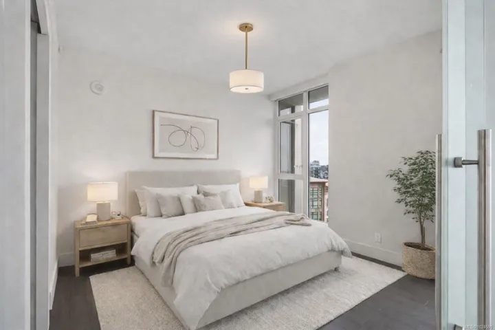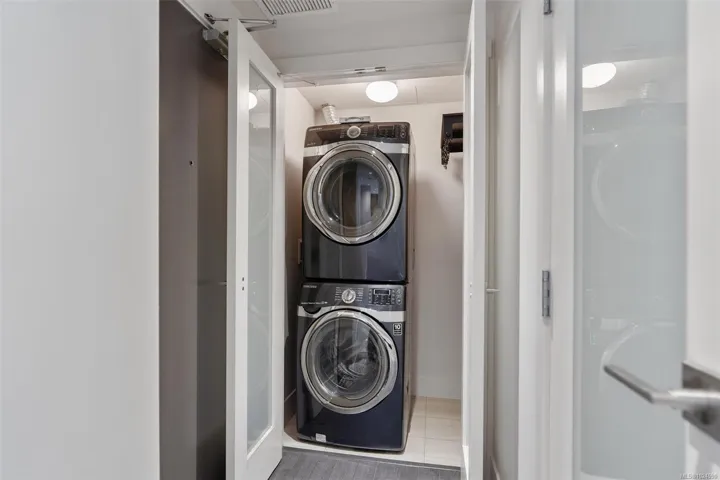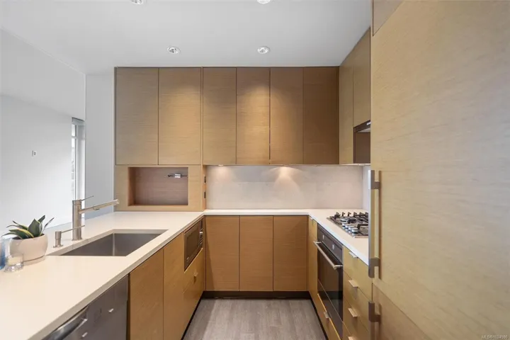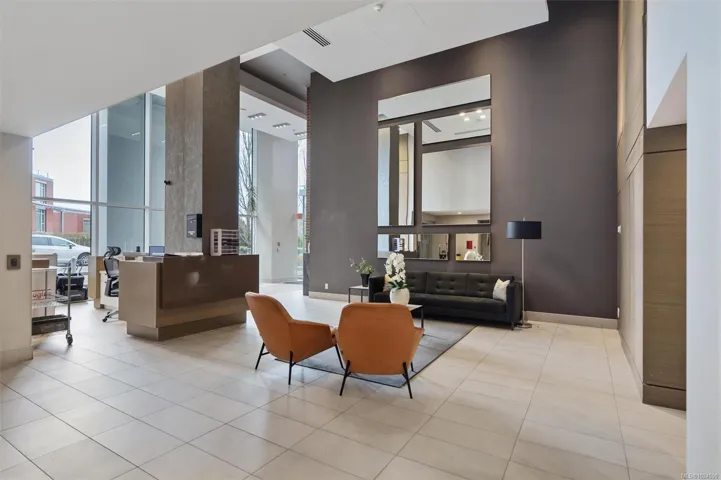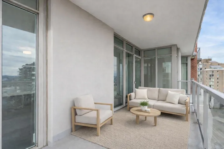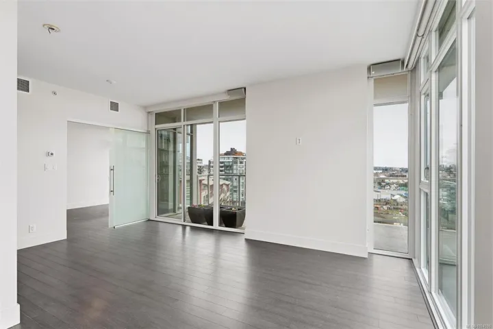 A truly unique floor plan – originally designed as a two-bedroom and thoughtfully reimagined into a spacious one-bedroom (with the easy option to convert back), this exceptional home is located in Promontory by Bosa. Modern southeast corner suite is flooded with natural light through floor-to-ceiling windows, offering sweeping views from every wall of the ocean, Olympic Mountains, and downtown skyline. The luxury kitchen is equipped with top-of-the-line appliances and overlooks a generous dining area, perfect for both everyday living and entertaining. A custom layout opens the living room to maximize ocean views, complemented by upgraded surround sound. Step outside to an expansive balcony, ideal for year-round enjoyment. Promontory offers concierge service, a fitness centre, social lounge, bike storage, outdoor spaces, and full air conditioning throughout. Surrounded by cafes, shops, restaurants, and entertainment. Just a 10-minute walk to downtown and the Inner Harbour.