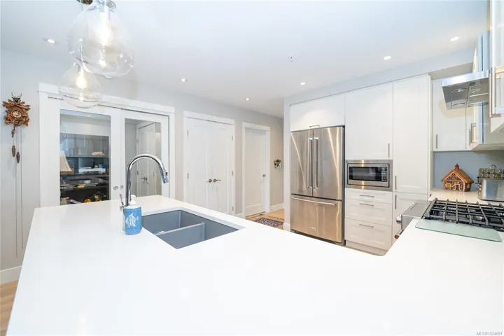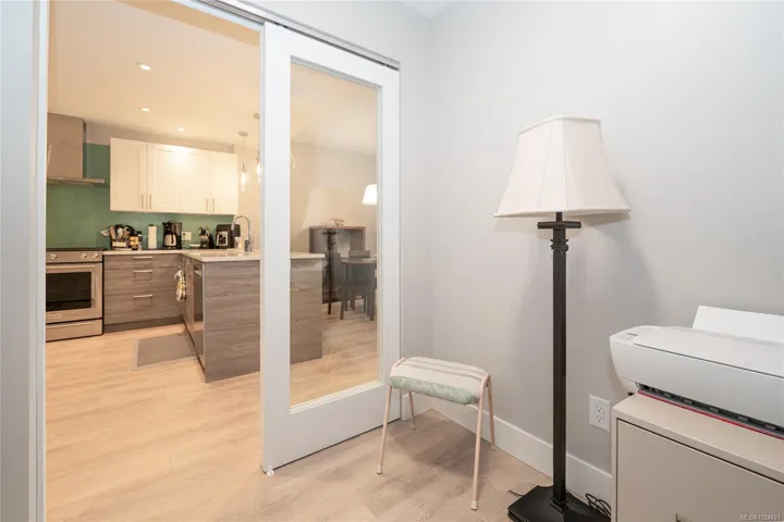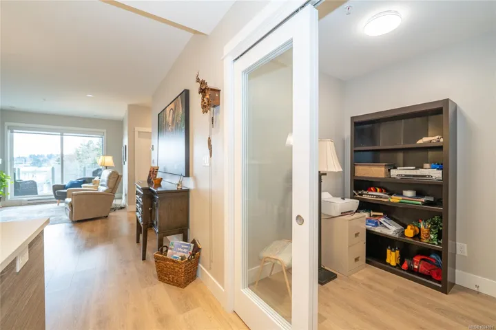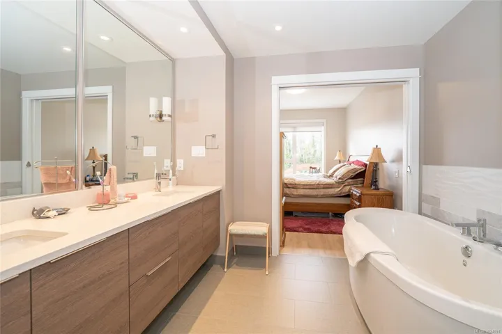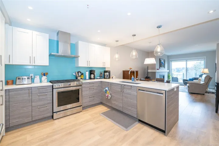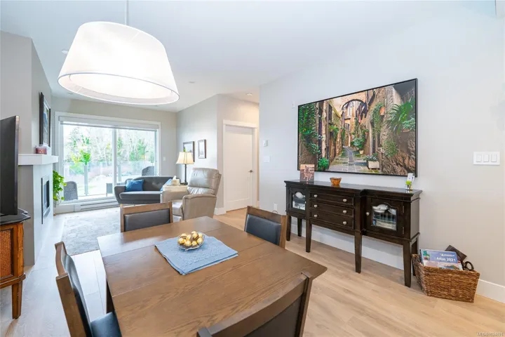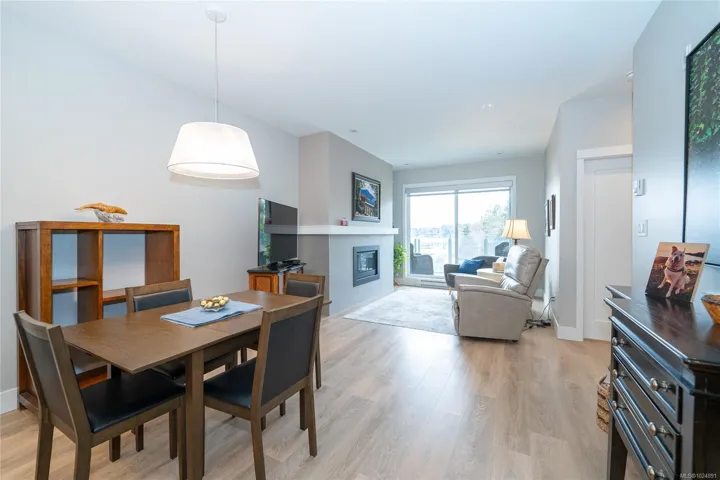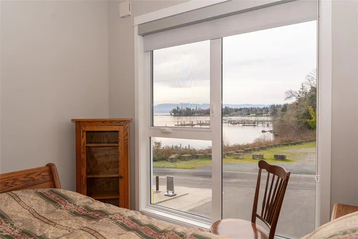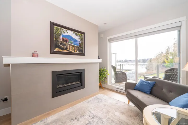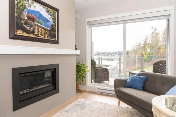Enjoy refined oceanfront living in this oversized 2-bed+Den, 2-bath residence offering just under 900 sq. ft. of thoughtfully designed space. The open-concept layout features a stylish kitchen with stainless KitchenAid appliances, gas range, quartz countertops, and seamless flow to the dining and living areas. Step outside to an expansive 263 sq. ft. patio with gas BBQ hookup—ideal for entertaining while taking in ocean and mountain views. Quality finishes include oak hardwood flooring, 9-ft ceilings, and oversized windows that flood the home with natural light. The king-size primary bedroom connects to a spa-inspired ensuite with dual vanities, soaker tub, glass shower, heated floors, and private water closet. A separate 3pc bath, secured underground parking, and storage locker complete the home. Located in the exclusive Residences on Sooke Harbour, a boutique collection of just 27 oceanfront homes offering a private fitness studio, kayak storage with ocean access, and secured entry.