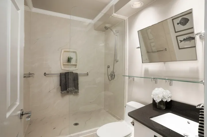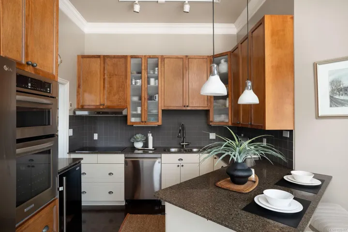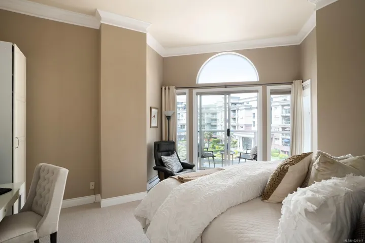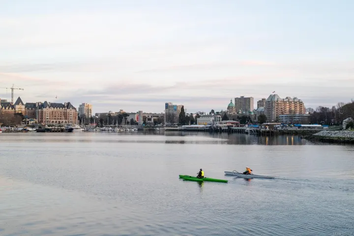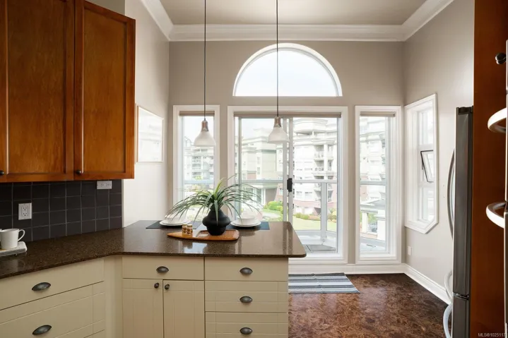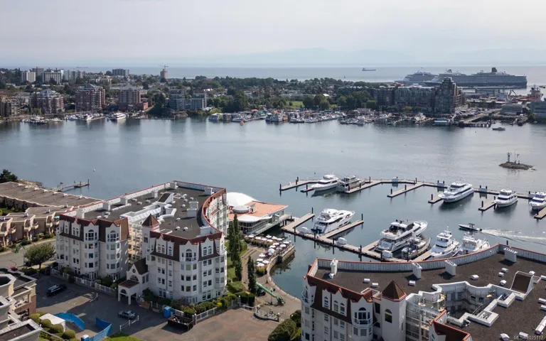 Soaring 11ft ceilings set the tone for this chic & spacious Corner Penthouse in prestigious Royal Quays, located in the heart of the Songhees. With 1,572 sqft of updated living space, this 2bed, 2bath home blends style & comfort w/Ocean glimpses w/float planes & kayaks passing by & downtown lights sparkling at night. A cozy gas fireplace warms the winters & 4 balconies invite you to soak in the surroundings year-round. The ideal layout places the bdrms on opposite sides of the condo, offering both privacy & functionality. Additional highlights incl. a functional kitchen, large laundry room & underground parking stall w/storage locker. Step outside & experience the Songhees lifestyle—walk the waterfront trail from West Bay Marina to downtown Victoria, w/local favourites like Spinnakers & Boom+Batten just steps from your door. Royal Quays offers an exceptional blend of luxury, convenience & community. A rare opportunity to experience penthouse living at its finest, along the waters edge.