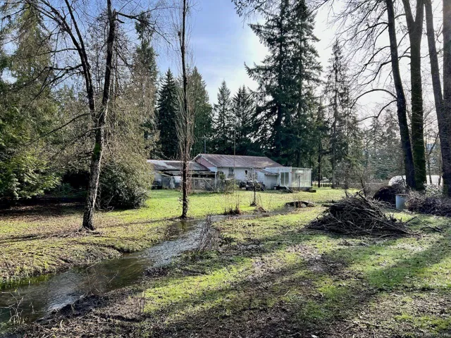 Situated on 2.3 acres, this property features a small watercourse running through the land and a two-bedroom home around 1300 ft2 with a two-car, approximately 1,000 FT2 garage. While the house and garage requires some TLC, it offers an excellent opportunity for buyers looking to build equity through their own improvements. Small shop on back of property around 150 ft2. The land is gated and fenced, backing onto a farm and conveniently located close to the airport, with easy highway access for commuting. The home, originally built in the 1950s, showcases a striking exterior rock chimney that serves as a strong architectural anchor.Renovations were started but not completed, The bathroom is not finished, leaving the finishing touches for the next owner. The property is on well and septic, and is zoned A1 Agricultural within the Agricultural Land Reserve, making it ideal for a small hobby farm.