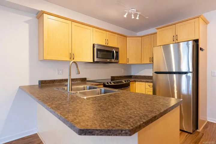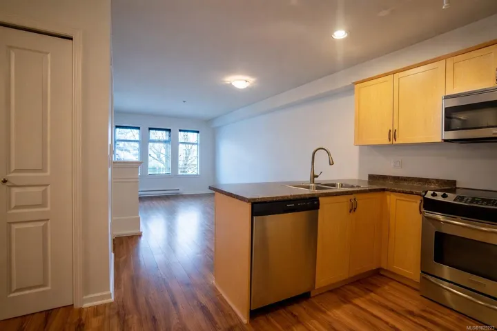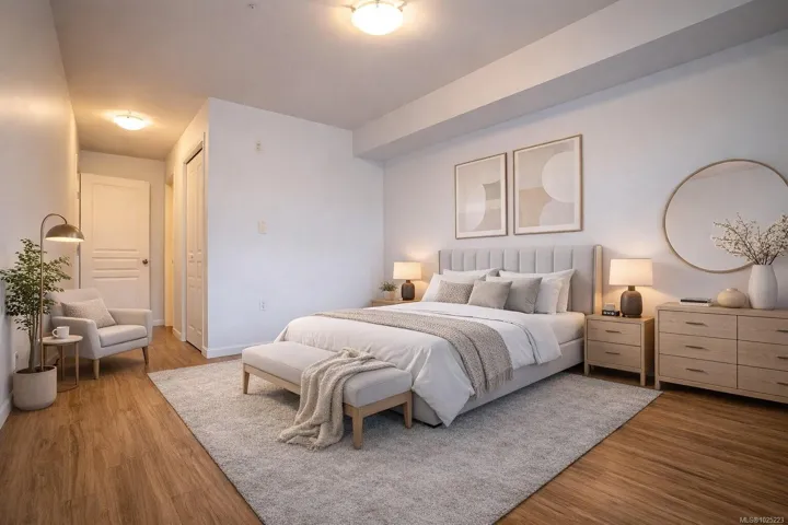 Welcome to 210–655 Goldstream Ave, a bright 2-bedroom, 2-bath home with 858 sq ft of thoughtfully designed living space in one of Langford’s most walkable areas. This modern West Coast–inspired unit features an open layout with new laminate flooring, a spacious kitchen with peninsula seating, and a cozy living room with an electric fireplace and access to a private balcony—ideal for morning coffee or summer BBQs. Bedrooms are separated for privacy; the primary offers a walk-in closet and 4-piece ensuite, while the second bedroom sits next to another full bath. Enjoy in-suite laundry, secure underground parking, and a separate storage locker. The pet- and rental-friendly building includes a fitness room, bike storage, a third-floor patio, and rooftop deck. Steps from the E&N Rail Trail, Royal Colwood Golf Club, transit, restaurants, parks, schools, and downtown Langford. Perfect for first-time buyers, downsizers, or investors.