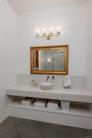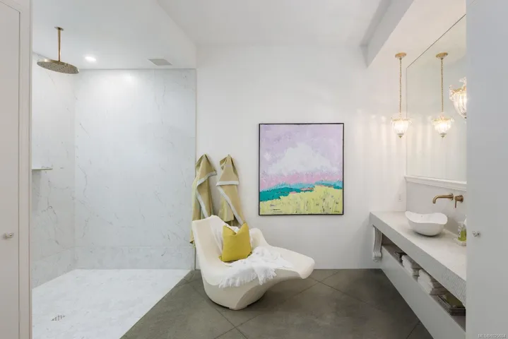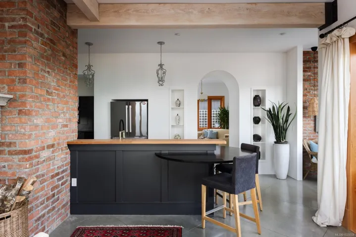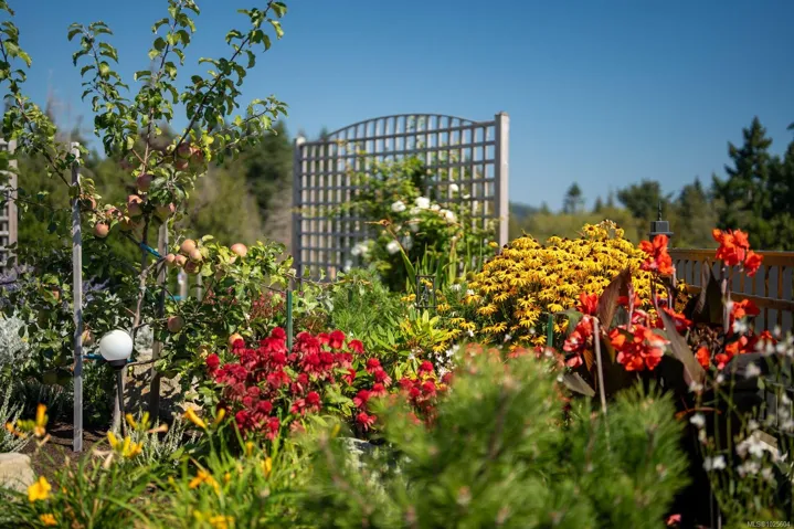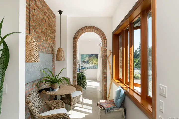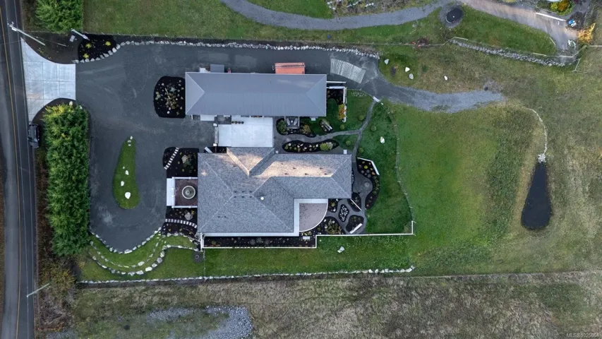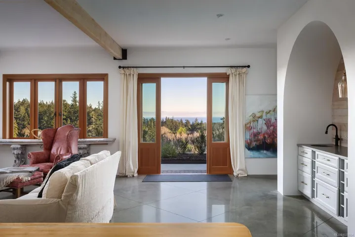 Nestled on 2.4 acres, this exceptional Metchosin estate features a 4,000+ sq.ft. Rancher & 1,380 sq.ft. detached building with an art studio, bathroom, workshop & garage. The exterior reflects French provincial elegance, with a granite façade, wrought iron detailing & a concrete water feature signaling the craftsmanship inside. Inside, concrete floors, exposed beams, brick accents, and inlaid wood detailing create an inviting, artistic atmosphere rarely seen in modern construction. The expansive great room centers on a bespoke fireplace & opens to the patio through multiple custom French doors. The kitchen includes a dedicated prep area for added convenience. The primary suite offers a serene, private retreat. Geothermal heating enhances efficiency and lowers the home’s carbon footprint. The property captures sweeping views across Haro Strait to the Olympic Mountains, providing a dramatic & inspiring backdrop to this one-of-a-kind estate.