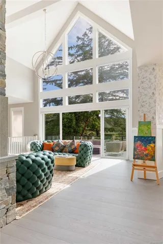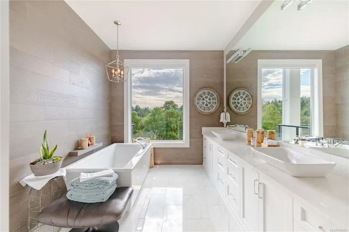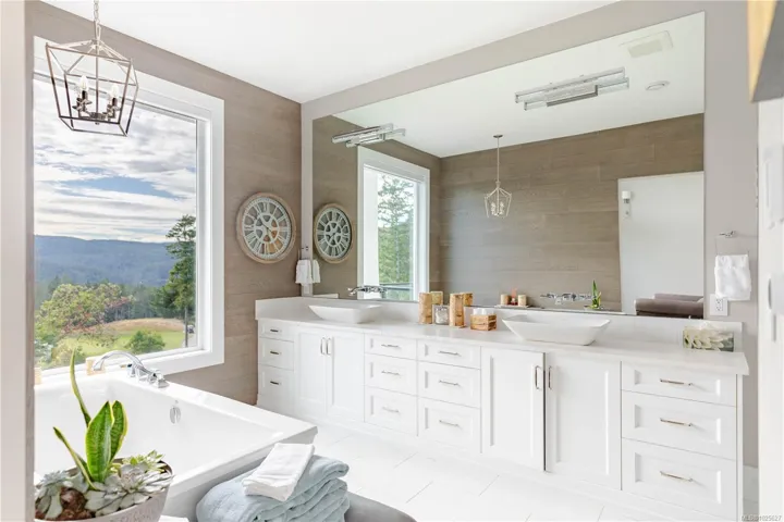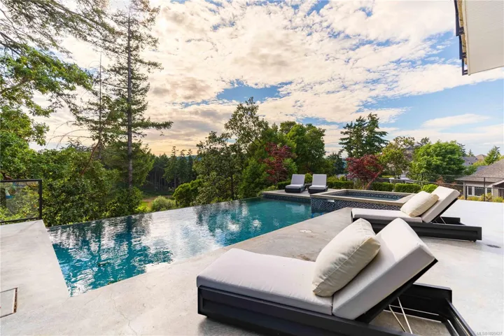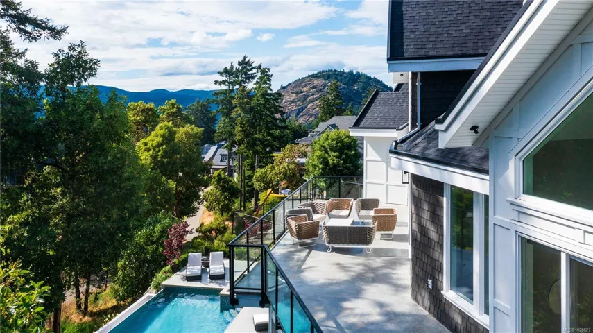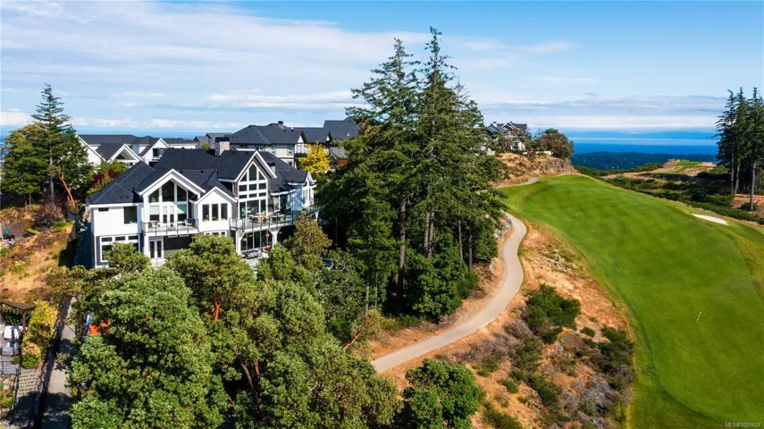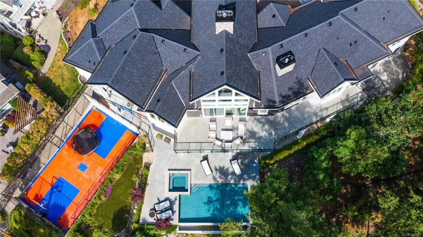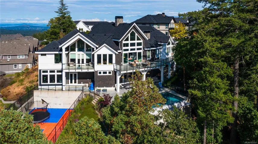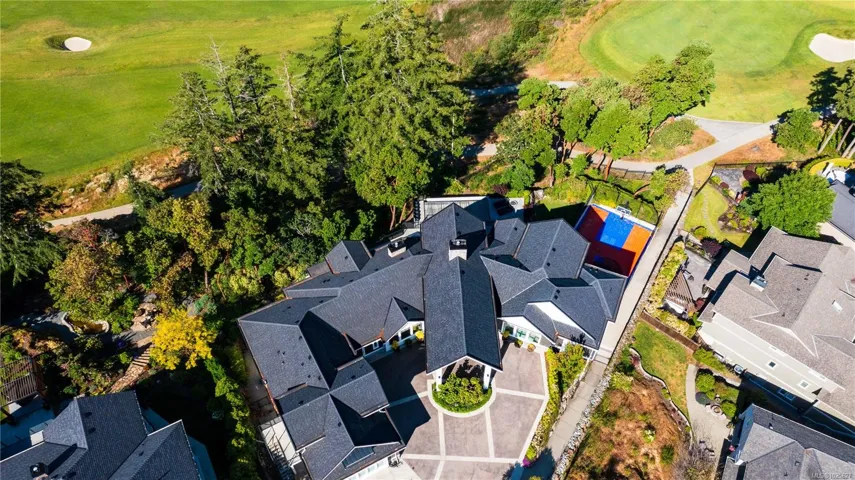 OPEN HOUSE Sat 2-4pm Apr 18th…Exceptional gated estate backing directly onto Bear Mountain Golf Course, offering 7BD/9BA and breathtaking mountain & city views. A grand roundabout drive with vaulted porte-cochère sets the tone, complemented by a 4 car attached garage plus golf cart garage with direct course access. Resort-style grounds feature a fenced sports court w/rubber surface, infinity pool & spa, and expansive patios ideal for entertaining. Inside, soaring vaulted & cathedral ceilings, floor-to-ceiling windows, and multiple heat pumps provide year-round comfort. The main level showcases a dramatic entry with two-way stone FP, gourmet kitchen w/WIP, private office, and a luxurious primary retreat with balcony, spa-inspired ensuite, and oversized walk-in shower. The lower level offers a rec room w/wet bar, tiered theatre, gym, and guest suite—all with pool deck walkouts. A separate 550 sqft guest suite includes private entry, balcony, open living/kitchen, full BA & laundry