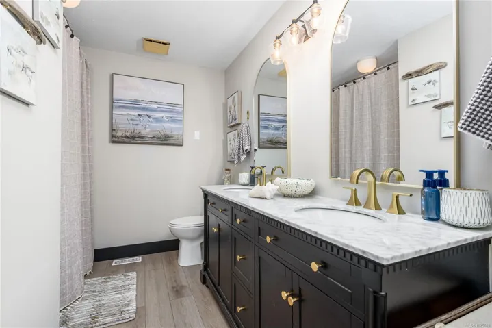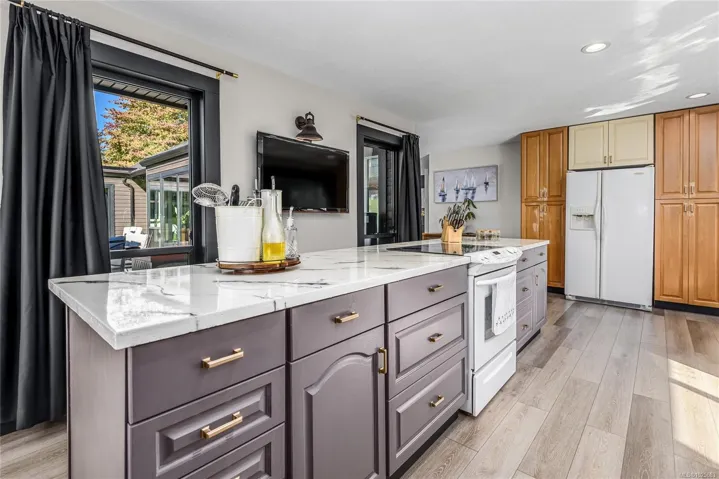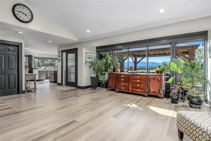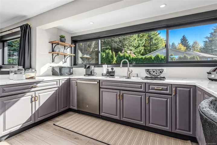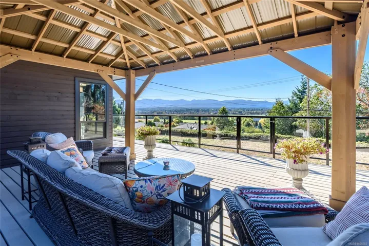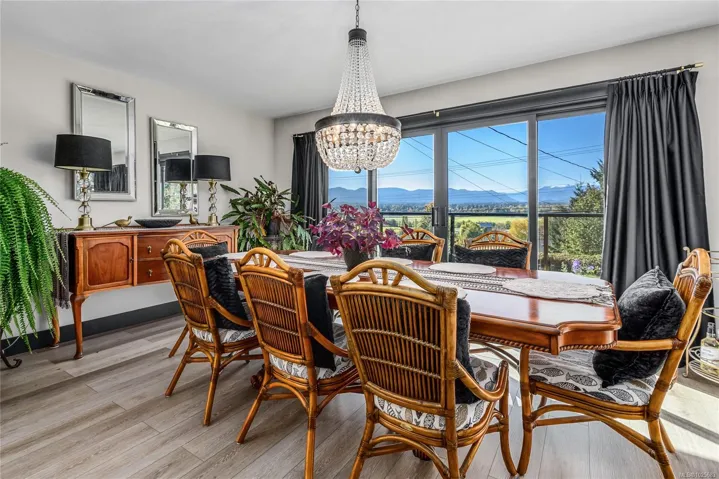 Panoramic Farm and Glacier and mountain views with a Southern exposure, this light and bright Rancher in East Courtenay features over 2,322 sq ft, and has been totally renovated. Recently renovated , it features luxury vinyl flooring, bright kitchen with large Island with breakfast bar, large picture windows above the sink, patio onto the deck with Gazebo, updated lighting, fresh paint, new vinyl windows, new asphalt roof & modern flooring. Primary bedroom with updated ensuite, 2 sets of French doors onto the patio, large walk-in closet, ensuite with double sinks.