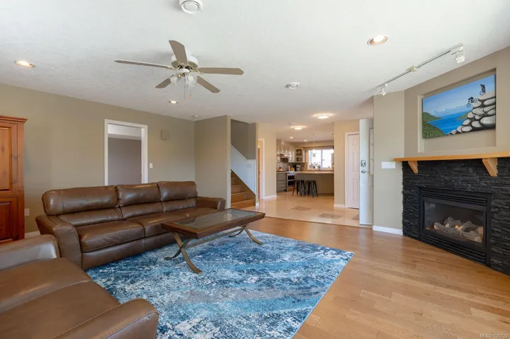 The main level includes the kitchen, the living room with a gas fire place, a bedroom, full bathroom, and laundry, while upstairs offers three additional bedrooms, including a spacious primary suite with a spa-like custom ensuite, and a family room with a gas fire place with access to a sunny upper deck. A second large rear patio provides even more outdoor living space.