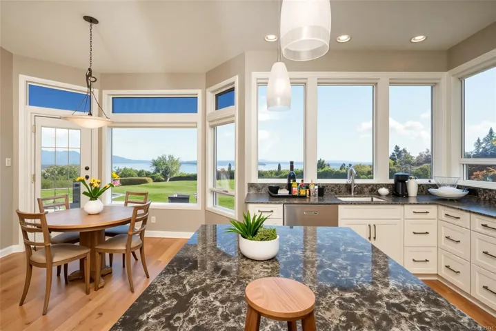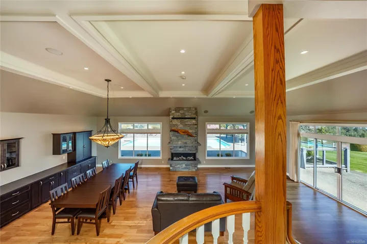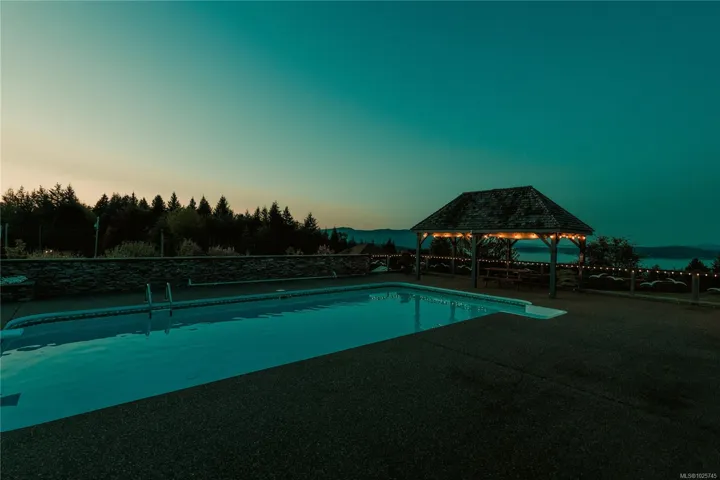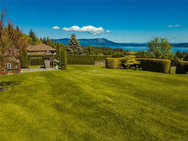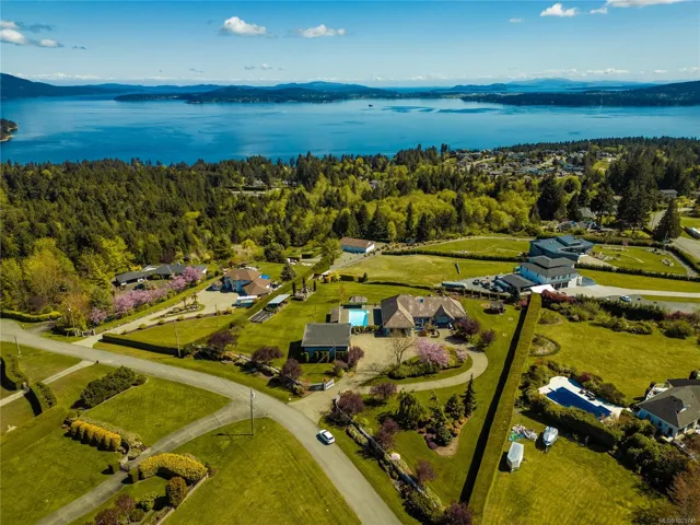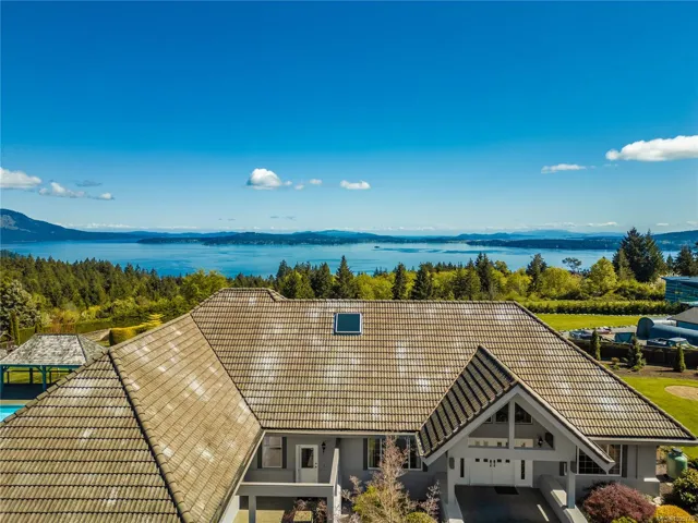 Presenting an opportunity to own a custom-built home looking for its second owners, nestled on 2 acres of perfectly landscaped grounds, offering sweeping, unobstructed ocean views. This exceptional 4-bed, 3-bath residence features soaring 13-ft vaulted ceilings, rich oak flooring & 2 stylish fireplaces. The gourmet kitchen is a chef’s dream, equipped with top-tier appliances. A custom wine room adds a touch of sophistication. The property includes a detached garage with enough height for an RV or perfect for extra vehicles, storage and a workshop. This property truly shines with a resort feel setting featuring a saltwater pool, an inviting cabana, and a picturesque gazebo all set amidst a fully irrigated, landscaped oasis bordered by mature privacy hedges and fences. A dedicated greenhouse & children’s playground family-friendly charm. A ride-on lawn mower is included for added convenience. Ideally located near Brentwood and Shawnigan schools, with nearby shops and amenities.