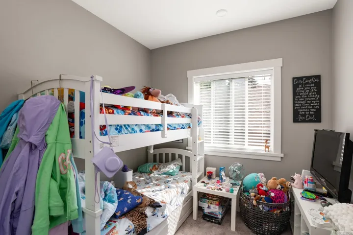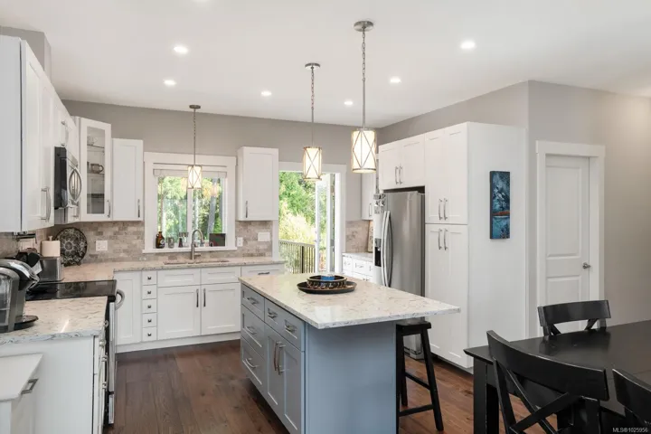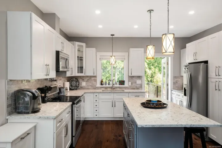 Welcome to this beautifully crafted 2018 home offering modern style, a quiet location, and unbeatable convenience. The main level features 3 bedrooms and 2 bathrooms, including a spacious primary suite with walk-in closet and full ensuite. The open-concept design highlights a bright living room with cozy gas fireplace and a stunning kitchen with quartz counters and stainless steel appliances. Enjoy entertaining on the large balcony overlooking the easy-care backyard, which backs onto green space for added privacy. Downstairs, a fully self-contained 1 bed/1 bath suite with in-suite laundry is perfect for extended family or a great mortgage helper. Additional features include a heat pump for year-round comfort and a double garage. Ideally located on a quiet road just minutes to all Langford amenities and only 20 minutes to downtown Victoria, this property delivers comfort, style, and value. Don’t miss this opportunity!